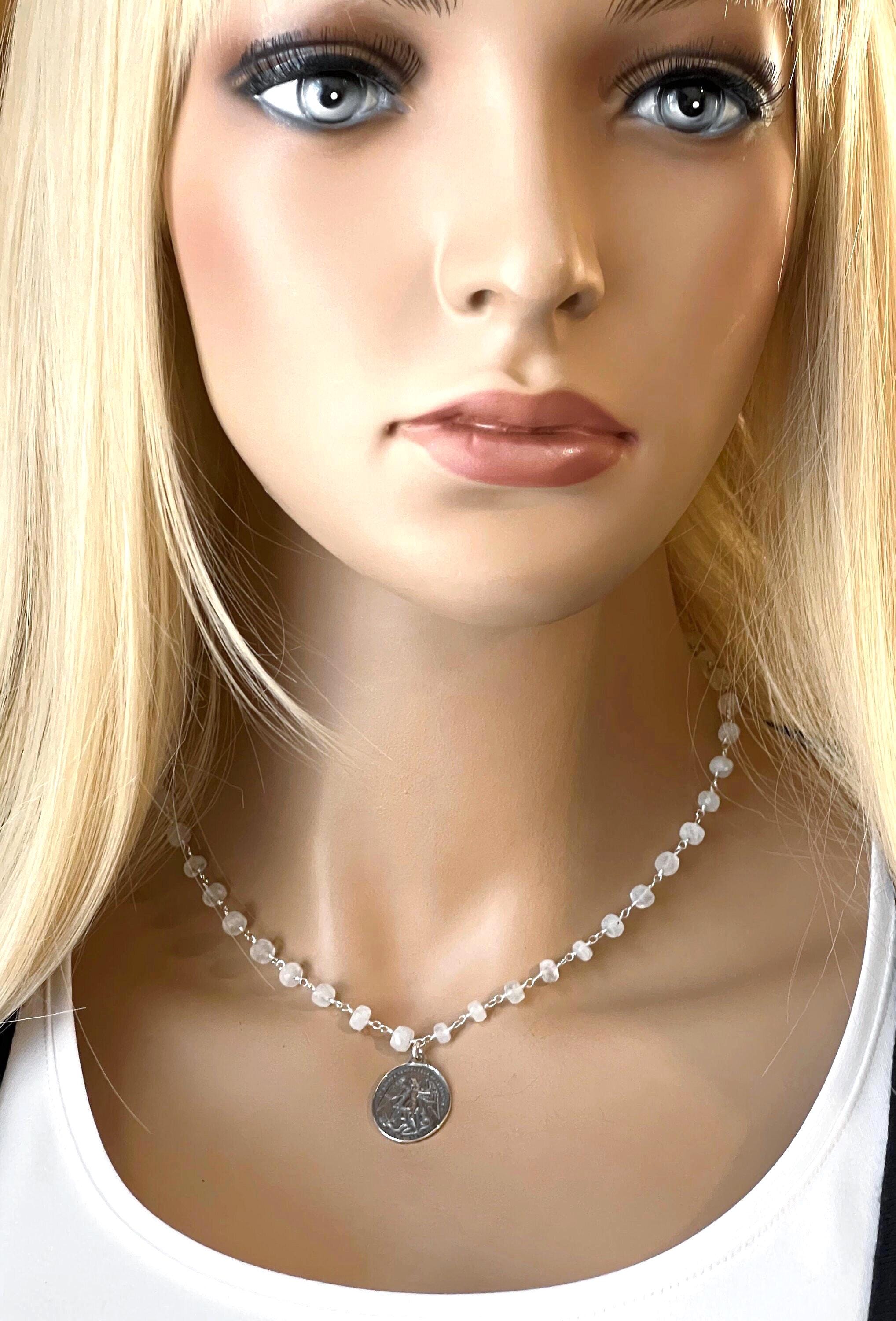 ♥ - A radiant expression of faith, this rosary necklace is handcrafted in sterling silver with genuine rainbow moonstone beads that glow with ethereal blue flashes. At its center hangs a sterling silver St. Michael medallion - protector, warrior, and guardian. A sacred piece designed with devotion, yet luminous enough to be worn as fine jewelry.