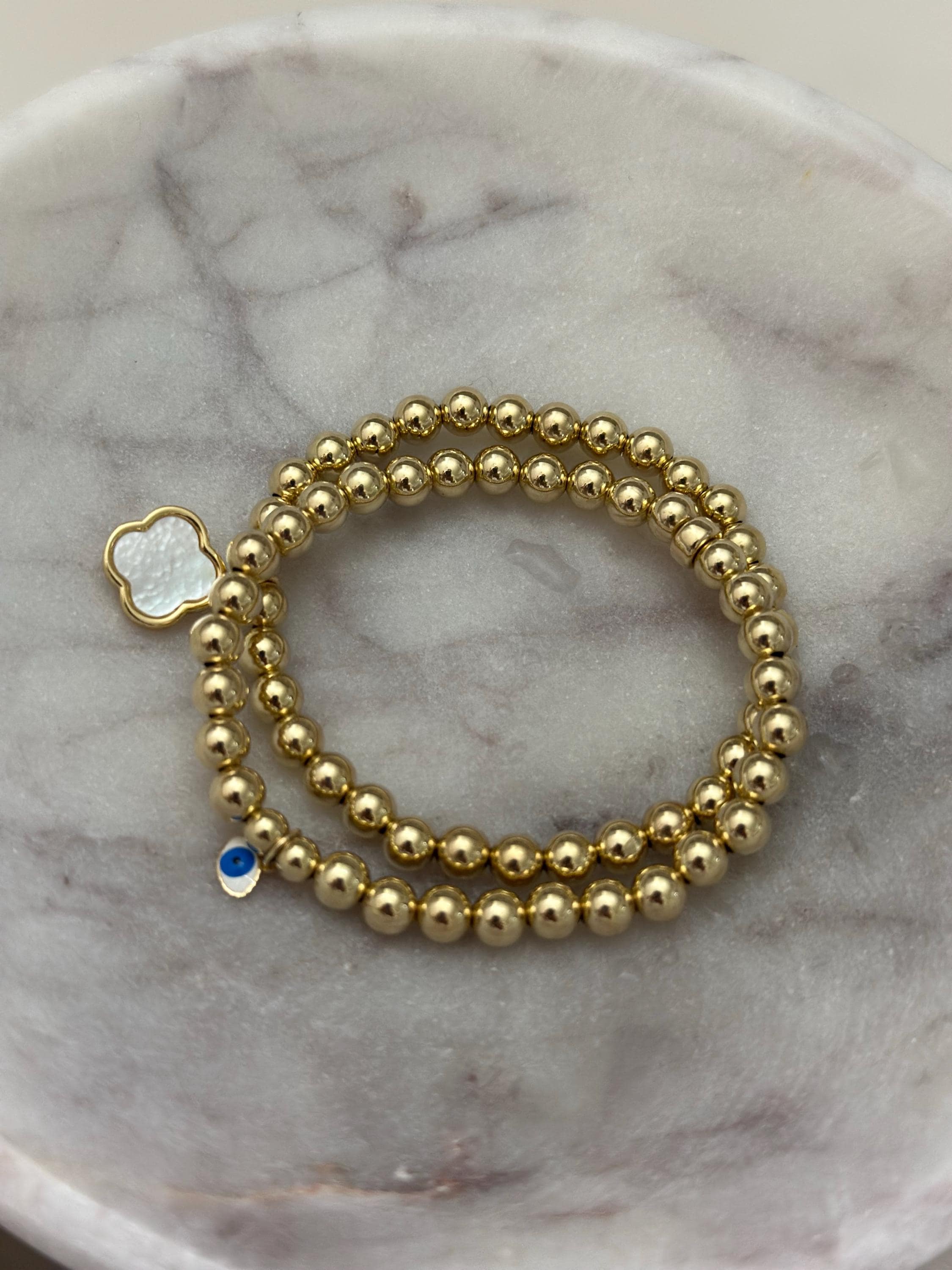 ♥ All 14k Gold filled large beads with a mother of pearl clover charm bracelet. This is just one bracelet. Find more stretch jewelry to layer here.