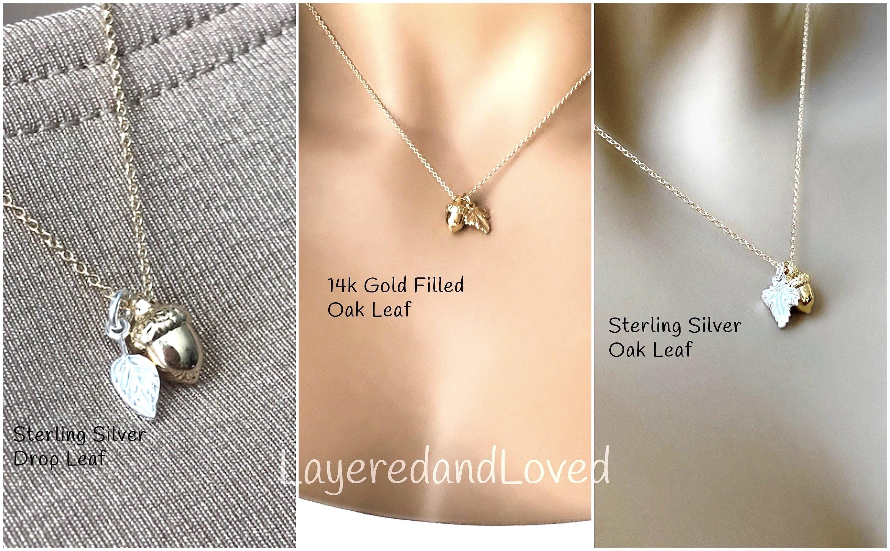 ~ I personally hand forge the oak leaf metal charm to fit smoothly against the acorn. I then polish the leaf to add a bright shine before they go on the chain. When you move it should fall right back into place against the acorn, or sometimes it might need a little soft touch. It's a beautifully dainty acorn and leaf floating on a 14k gold filled slim line chain. Similar style on Kate. You have a choice of leaves, 14k gold filled or sterling silver oak leaf, and a sterling silver drop leaf charm (this leaf I do not bend, it has a bend on its own). Choose your leaf in one menu and the length in the other.