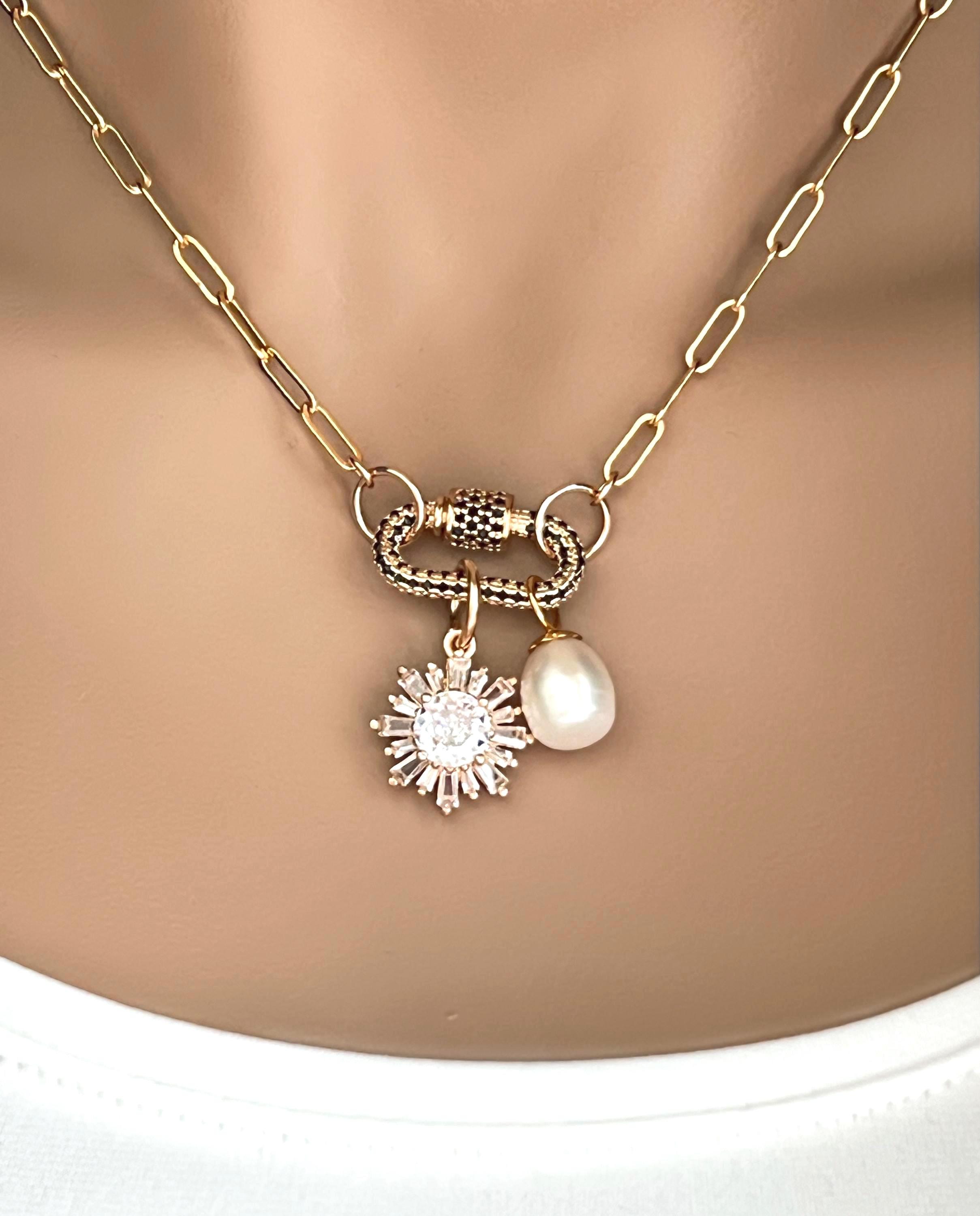 ♥ - Large link paperclip chain all 14k gold filled, including the large rings. The zircon clasp is gold plated and called a carabiner clasp closure, one end of it screws open. Your necklace will come with the 2 charms shown, a freshwater pearl with a 14k gold filled fluted bail top and a large zircon flower charm. With the flower charm you have a choice of either a clear center or pink. The bail rings on the charms are big enough you could use them on other necklaces too. Mix and match or wear it simple with no charms. You have several options with this necklace.