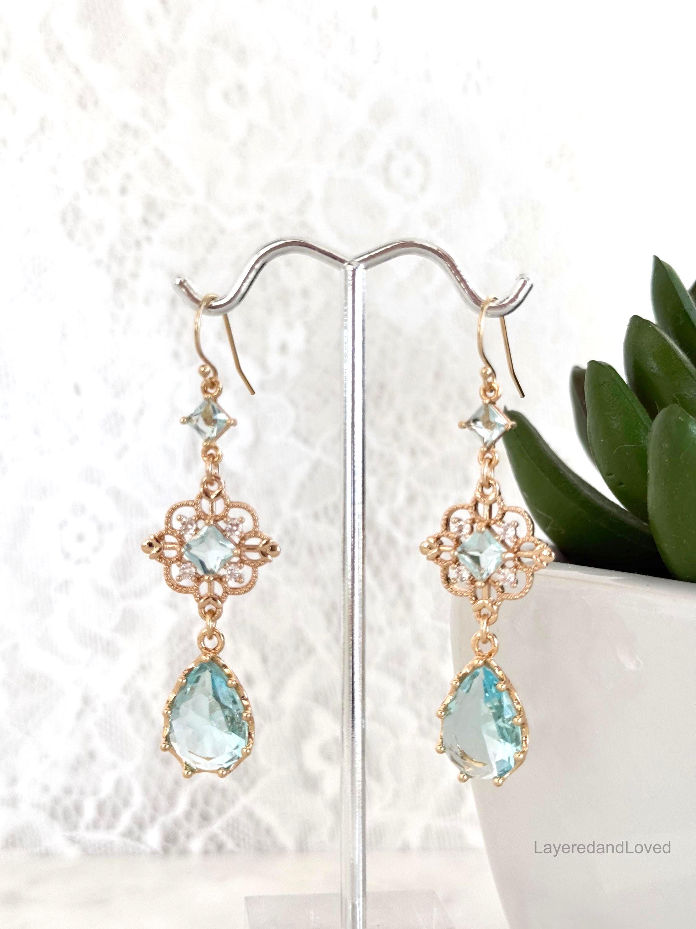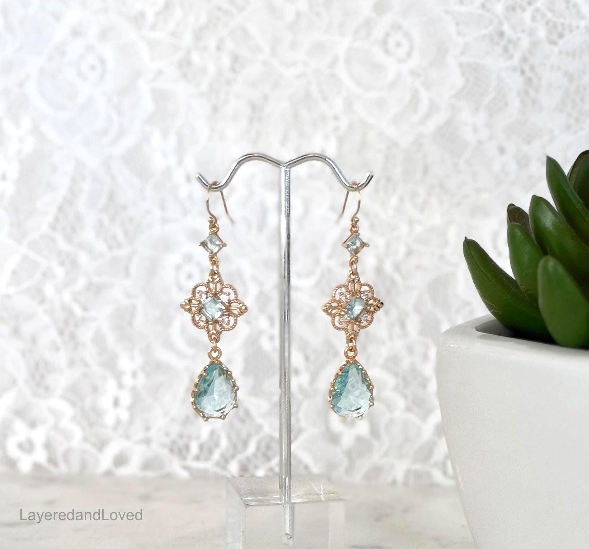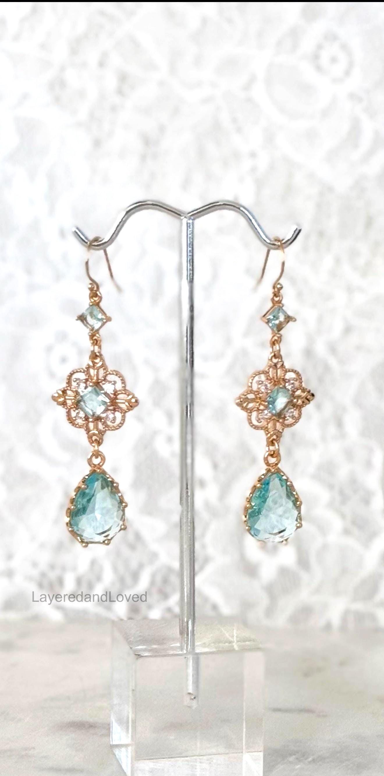 ★ - Suspended from 14k gold filled earwires, these earrings feel regal yet airy, dramatic enough for a formal entrance, yet refined enough for timeless bridal styling. The soft lake blue tone makes them a beautiful choice for weddings, bridesmaids, mother of the bride, or anyone drawn to romantic vintage design.