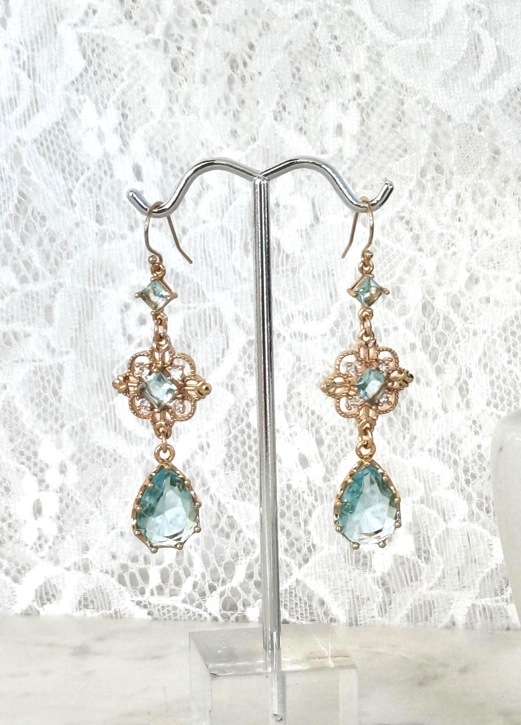 ★ - Romantic heirloom elegance with a soft "something blue" glow. These graceful chandelier earrings feature luminous layers of soft lake blue faceted stones, designed to shimmer beautifully in the light. At the top, a delicate diamond shaped blue connector leads to a Victorian inspired centerpiece with intricate detailing and a radiant blue focal stone. A matching teardrop drop completes the silhouette, catching the light with every movement.