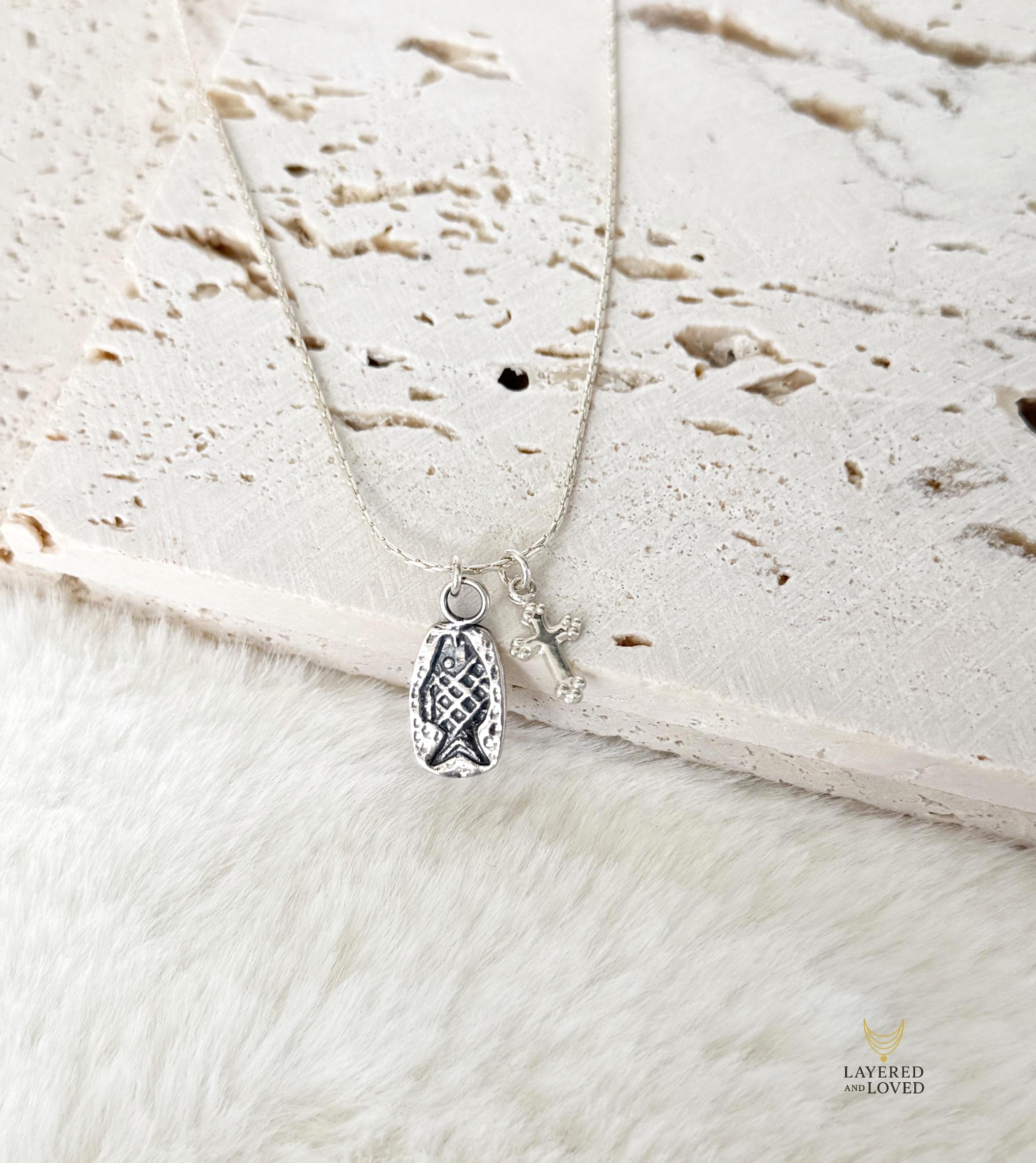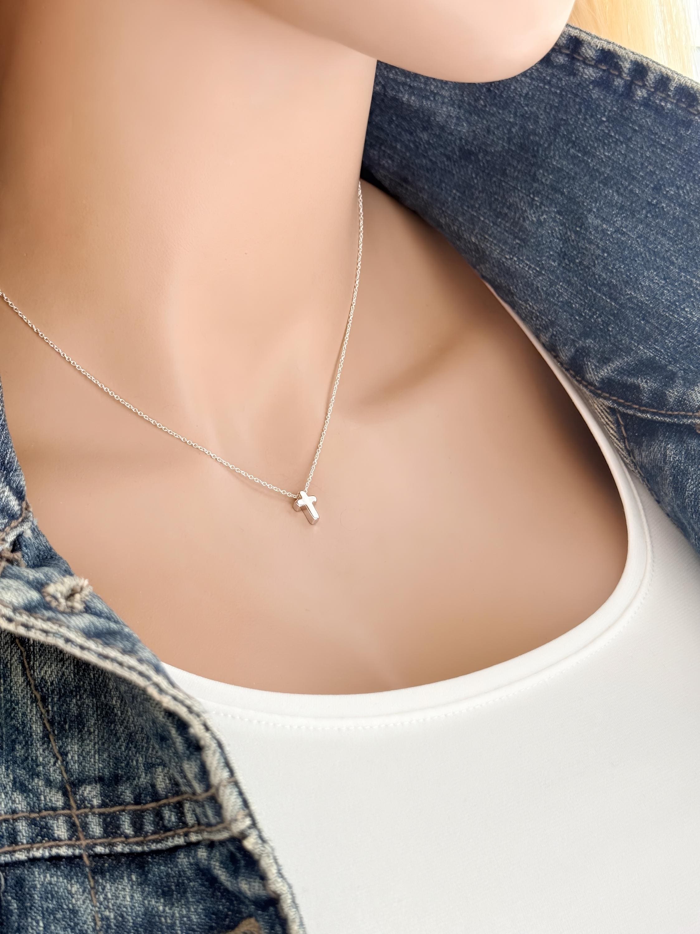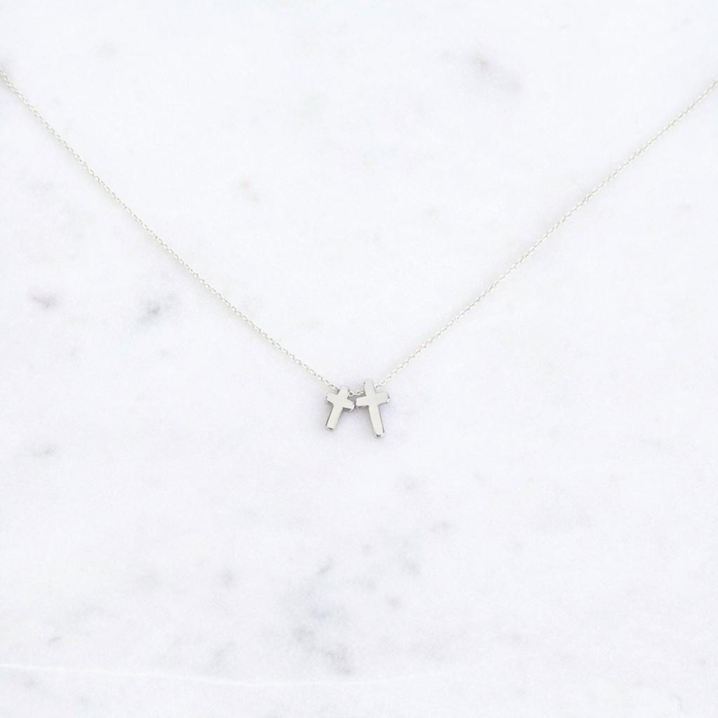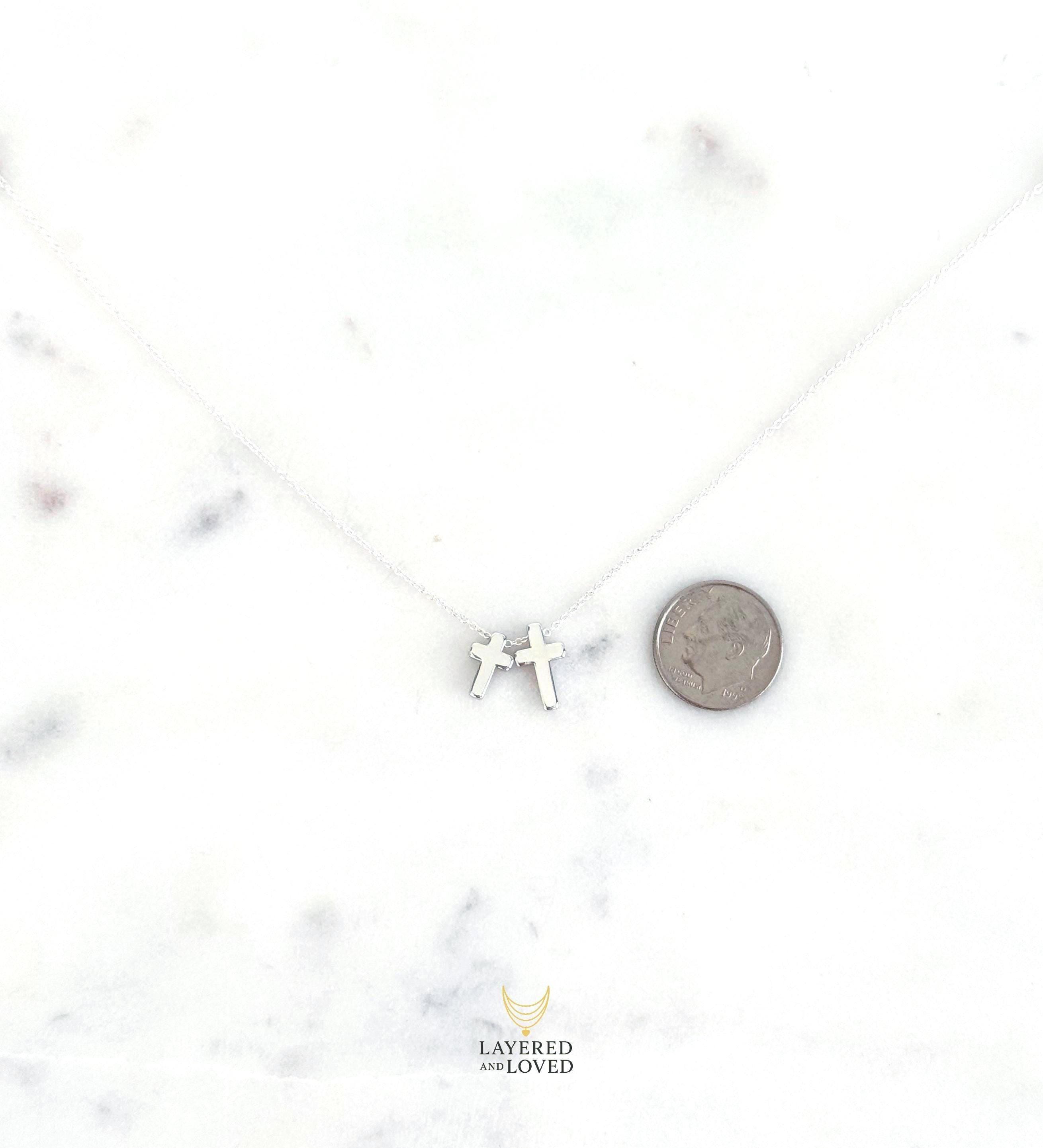 ~ This coordinating set includes two fine sterling silver chain necklaces with sleek sliding crosses designed to rest naturally at the center of the chest.