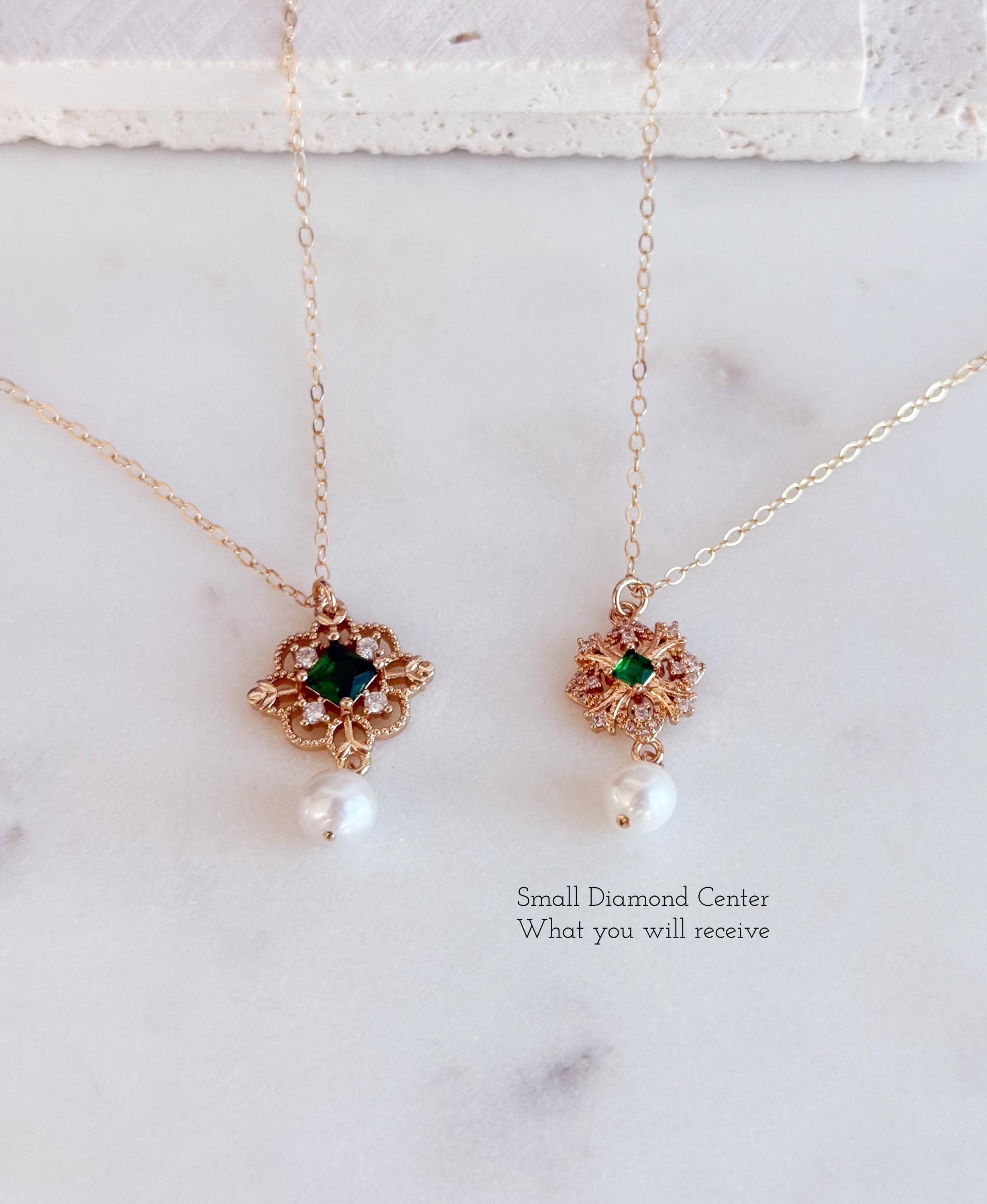 ★ - Step in the world of Regency romance with these Bridgerton inspired earrings. Brilliant sparkling clear zircons surrounding a small emerald green diamond center, finishing in a luminous freshwater white drop pearl. Set on 14k gold filled earwires, comfortably secure with silicone backings. Choice of the earrings alone or include a matching necklace with the same drop pearl charm suspended on a 14k gold filled chain. This design captures timeless elegance with a touch of aristocratic glamour.