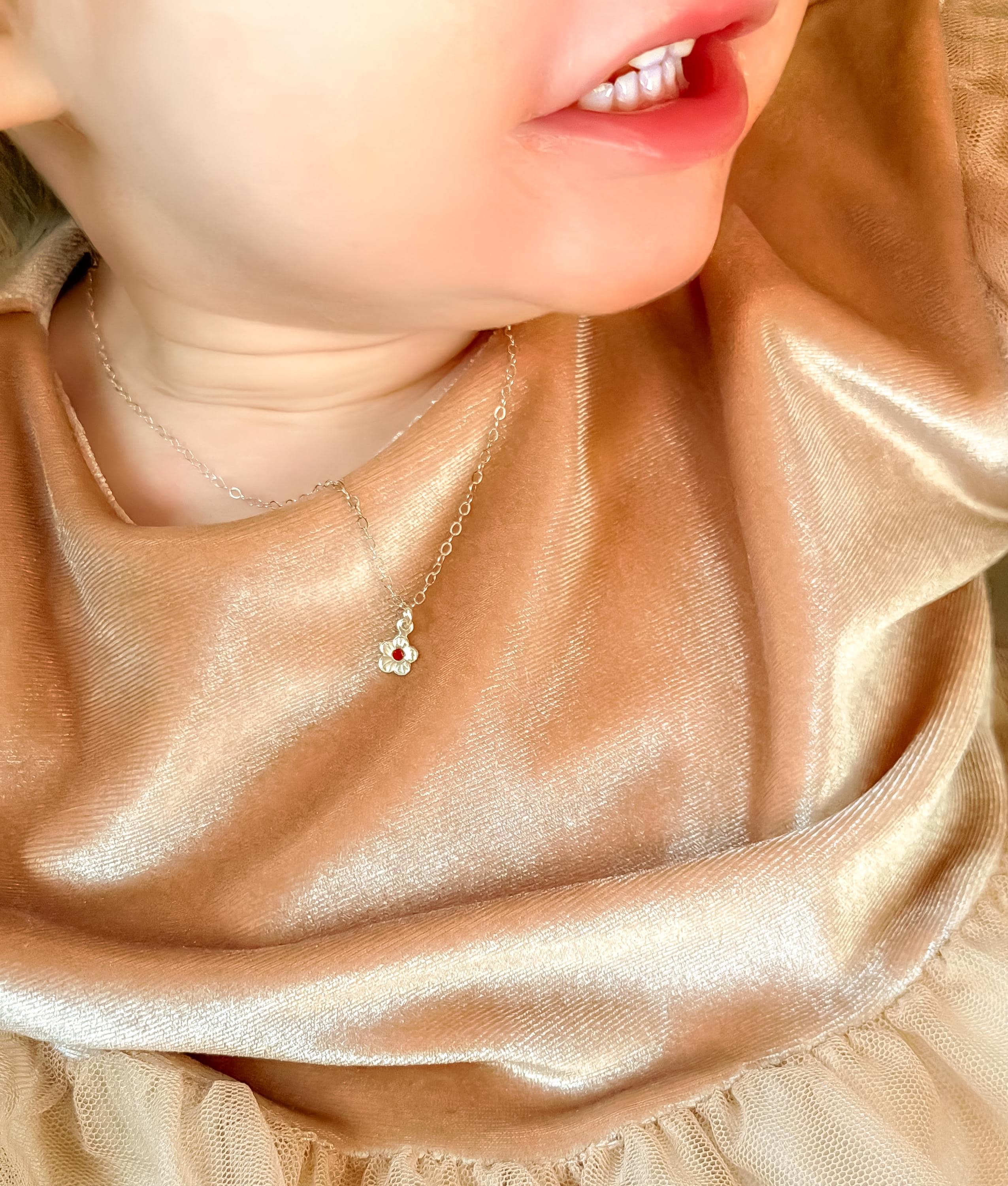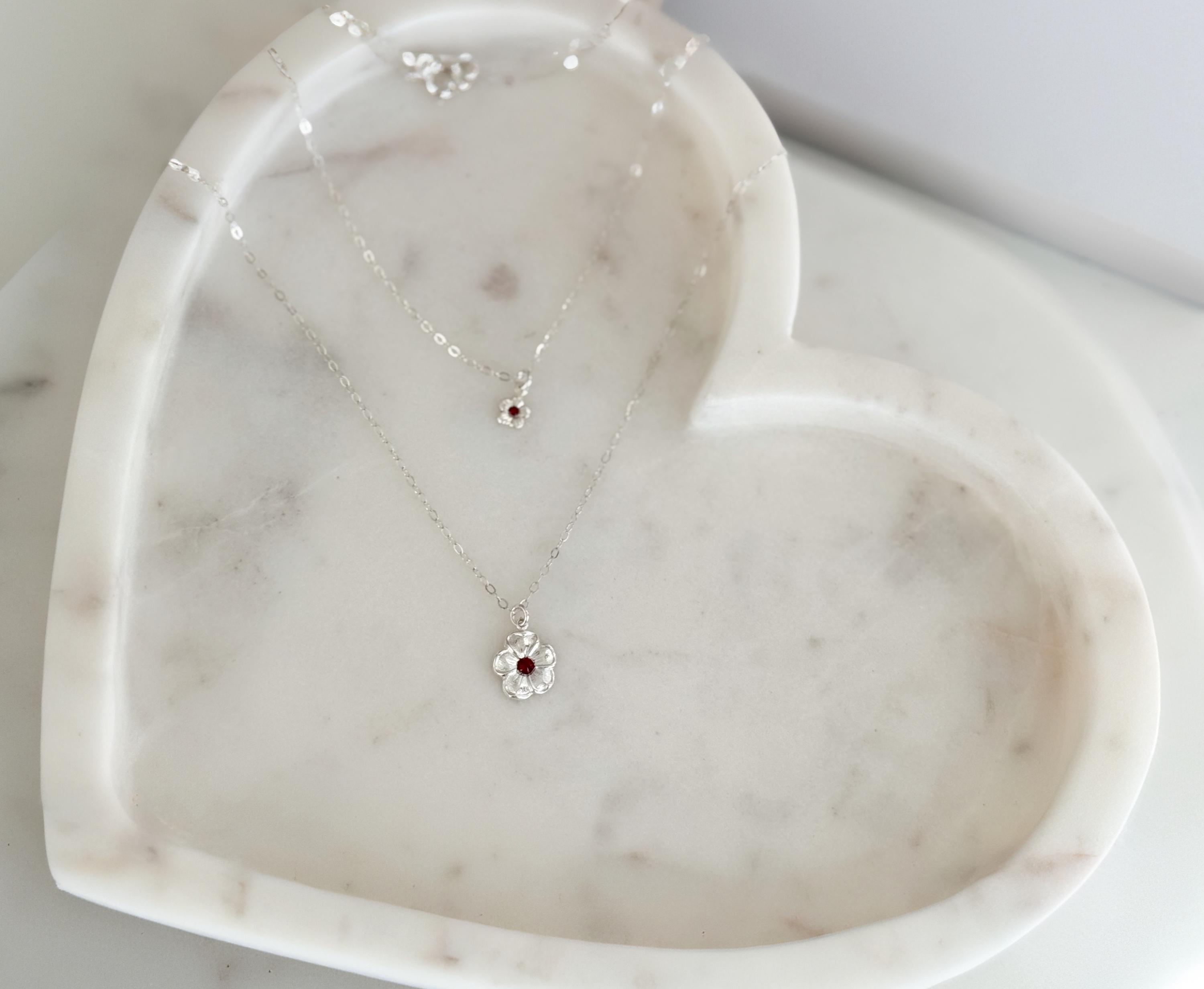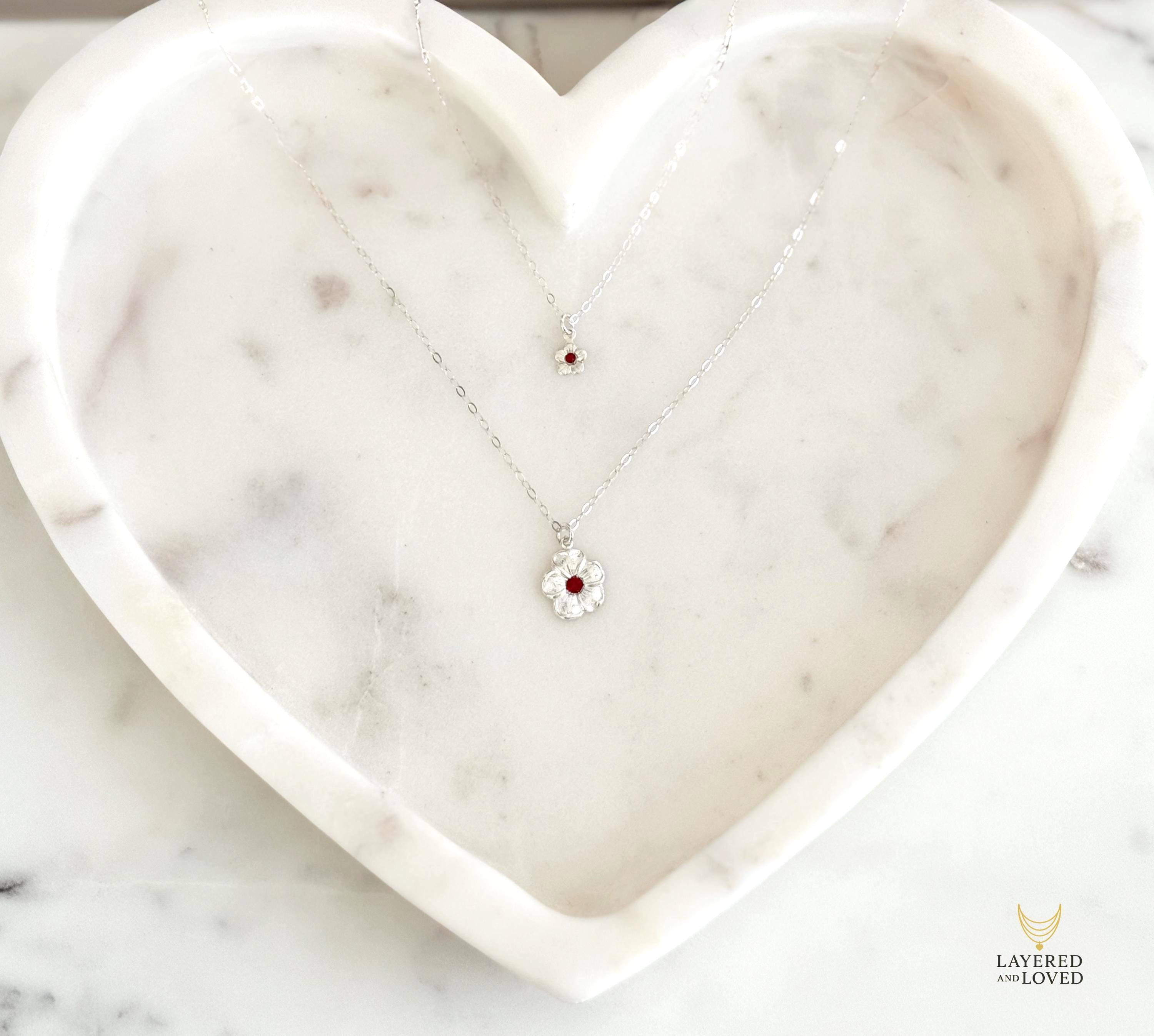 ♥ A meaningful matching necklace set to celebrate the special bond between mother and child. Each necklace features a delicate sterling silver flower charm, centered with a sparkling birthstone that represents love, connection, and individuality.