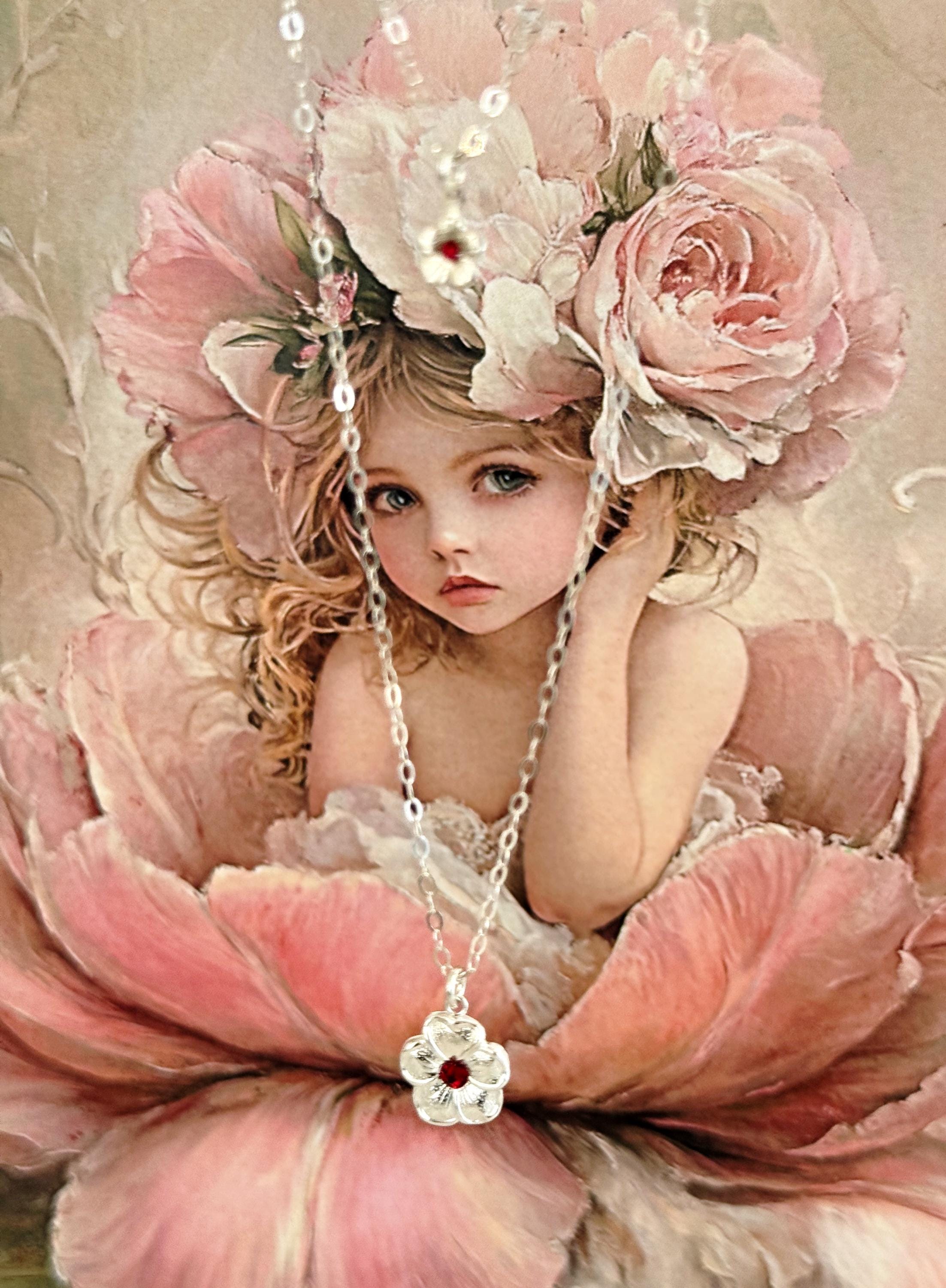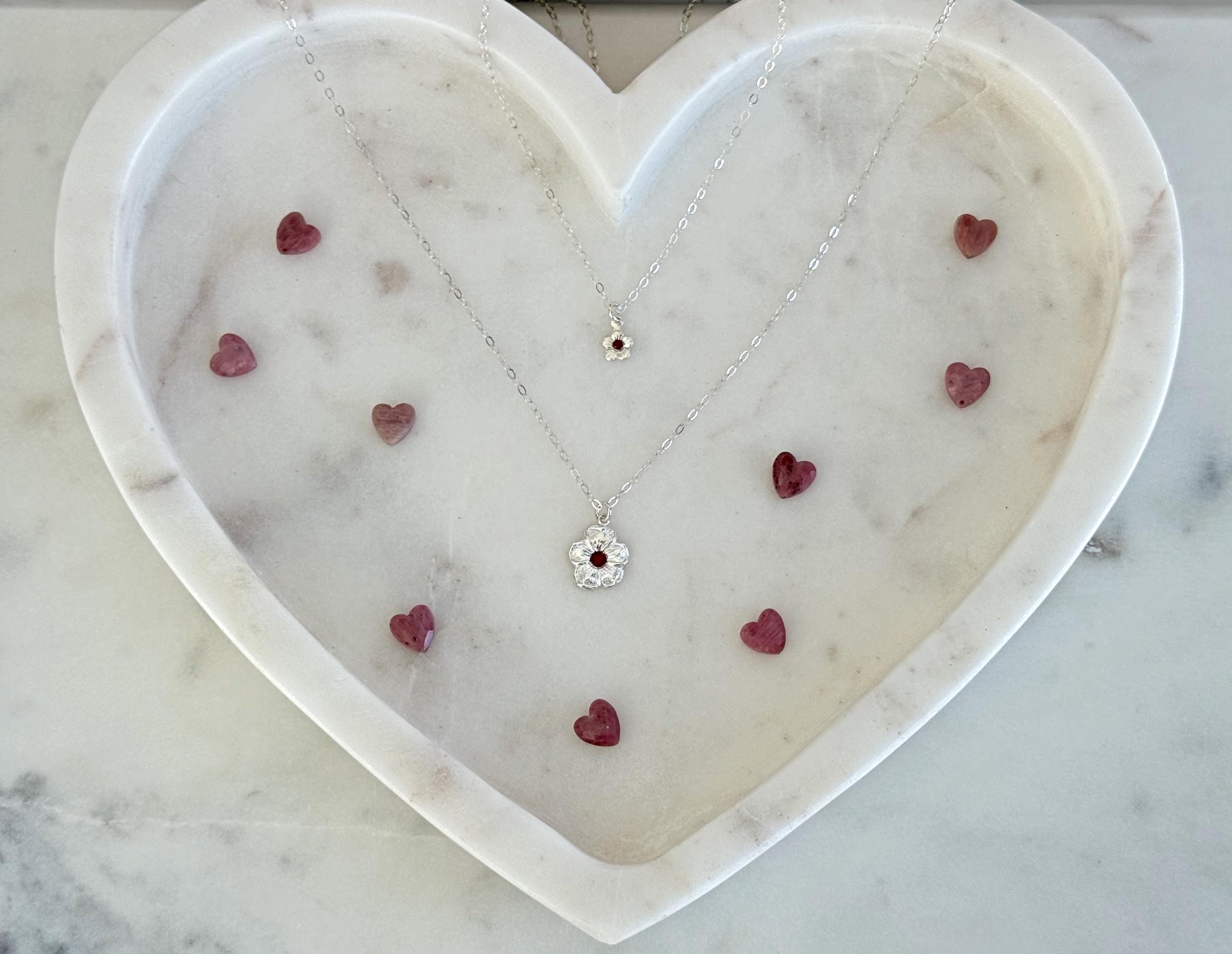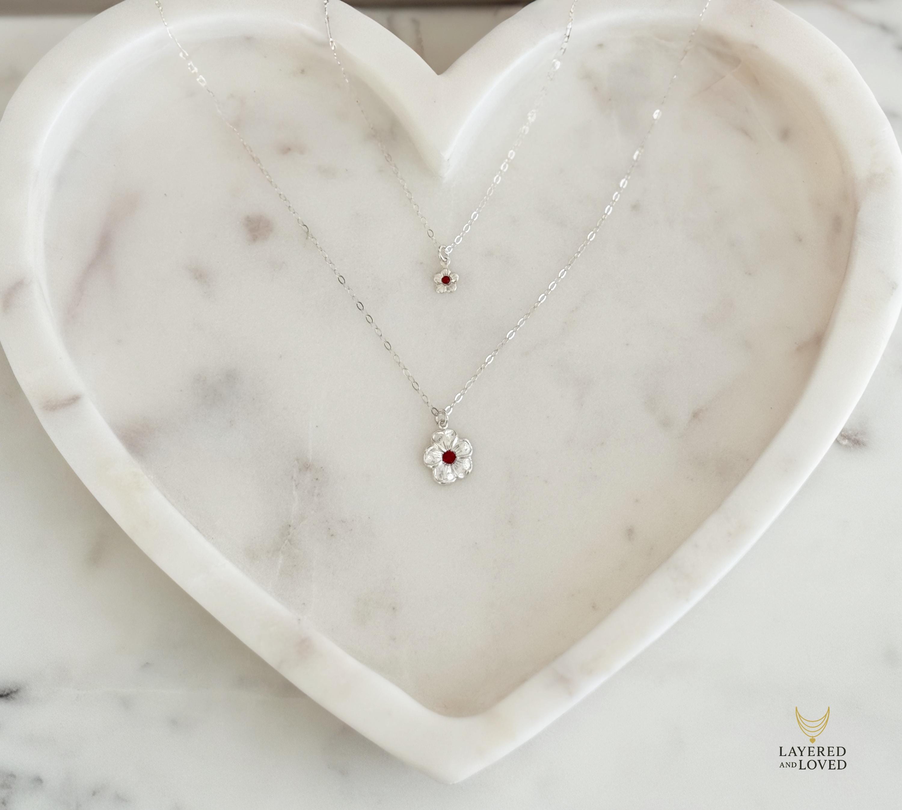 ♥ A meaningful matching necklace set to celebrate the special bond between mother and child. Each necklace features a delicate sterling silver flower charm, centered with a sparkling birthstone that represents love, connection, and individuality.