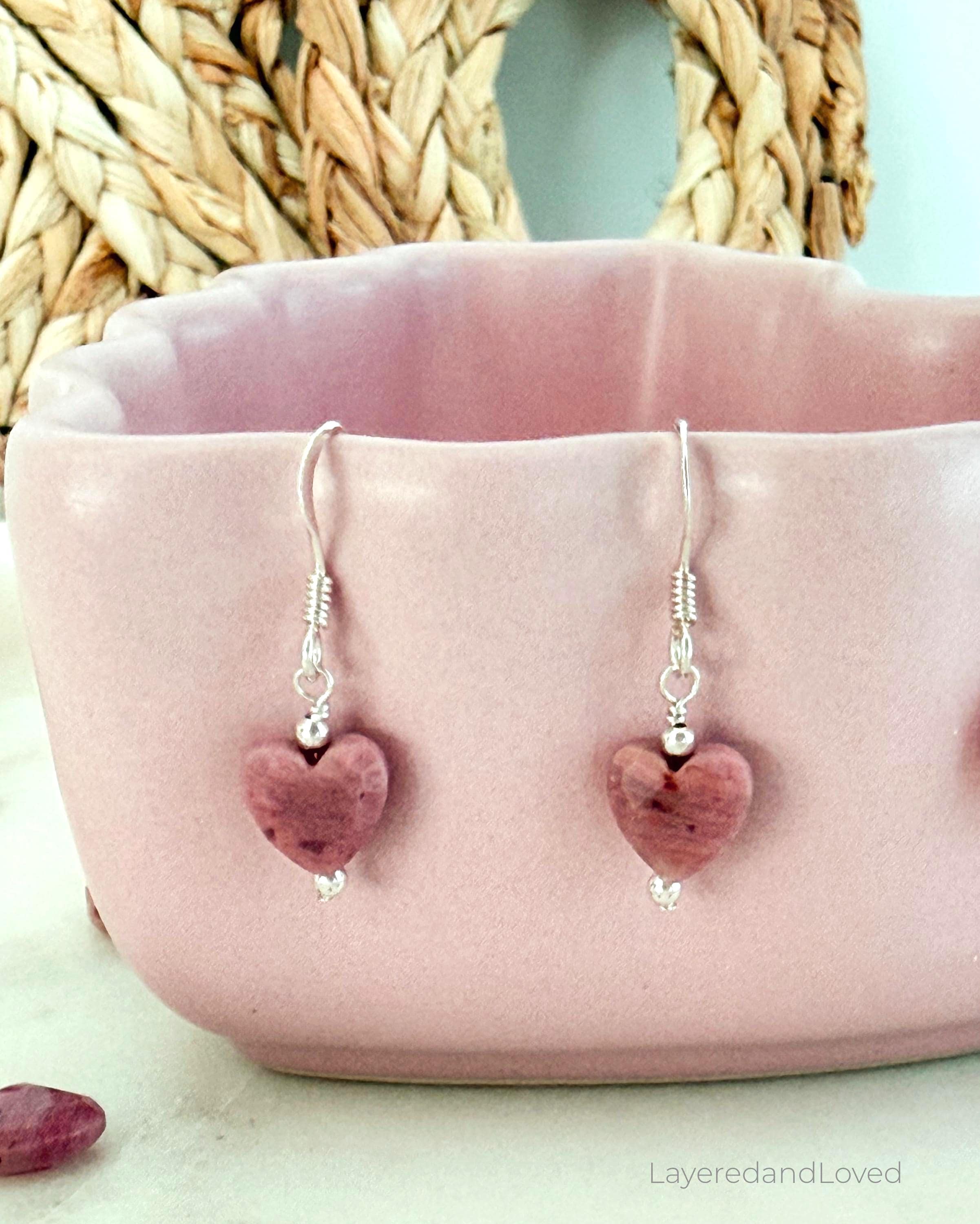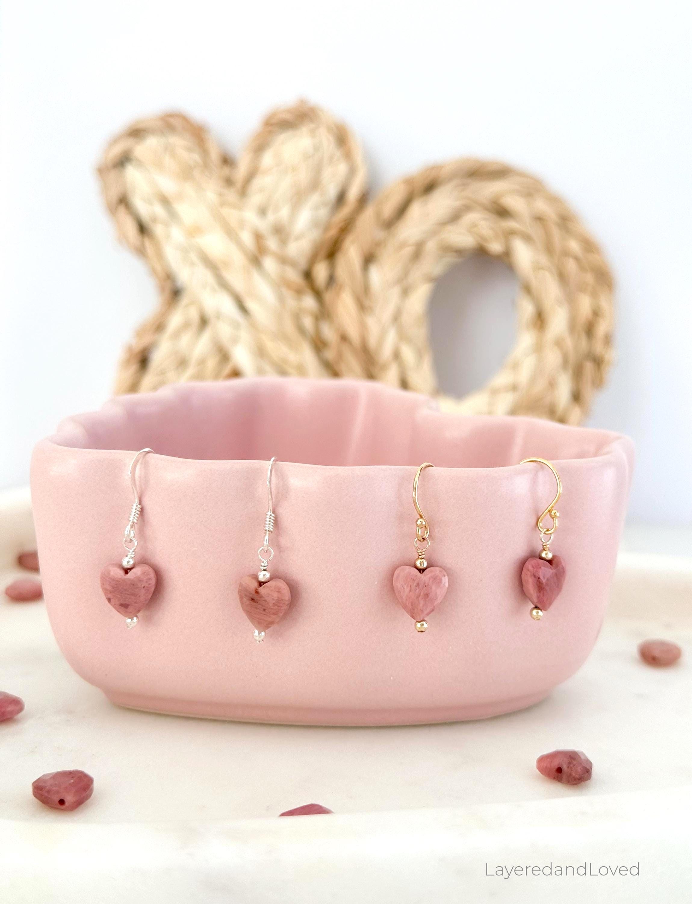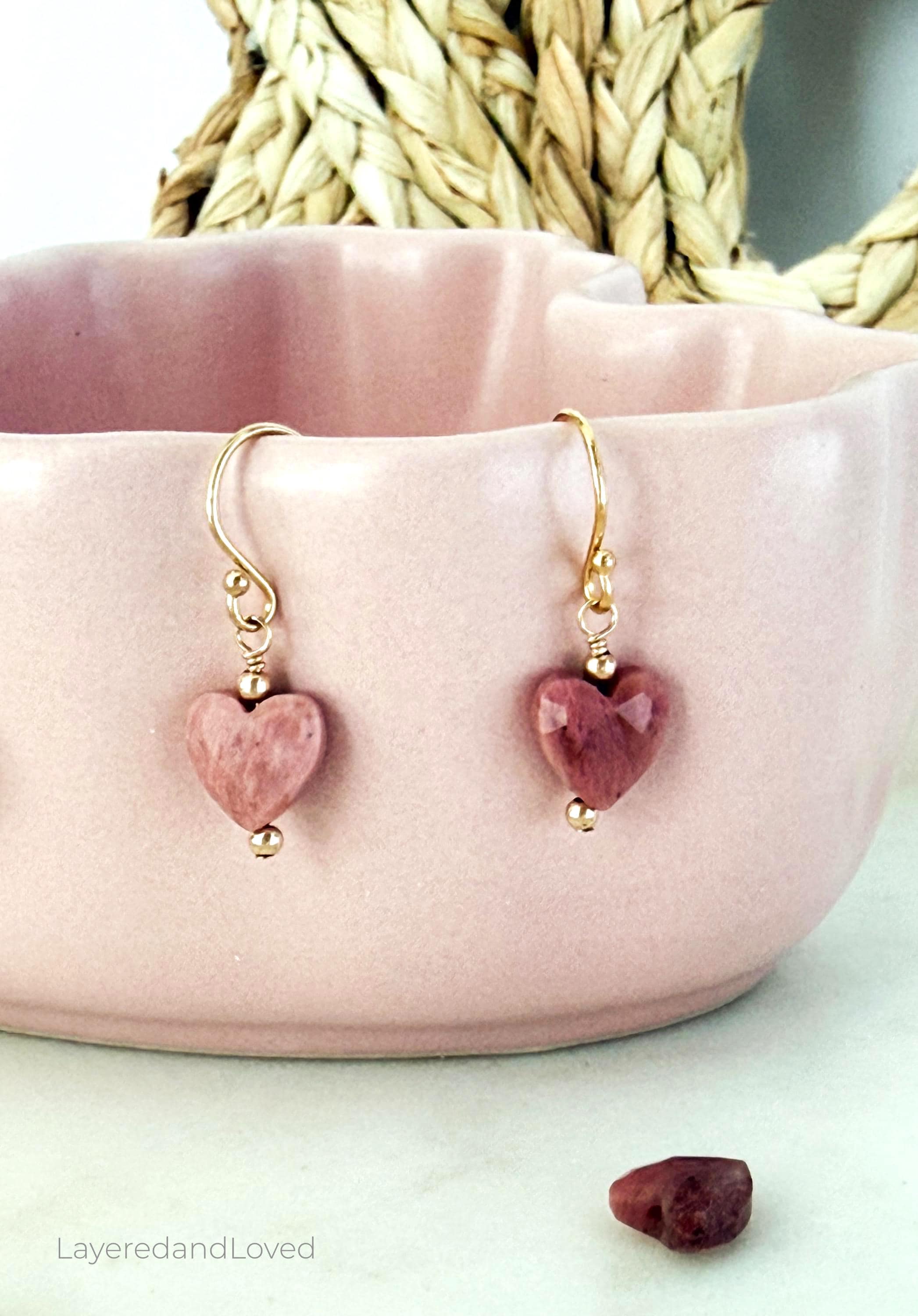 ♥ Delicate faceted rhodochrosite gemstone hearts dangle gracefully from your choice of sterling silver or 14k gold filled earwires. Their soft rosy blush tones and subtle sparkle make them the perfect little love token for Valentine's Day, anniversaries. or everyday romance. A lovely gift for someone you love, or for yourself.
