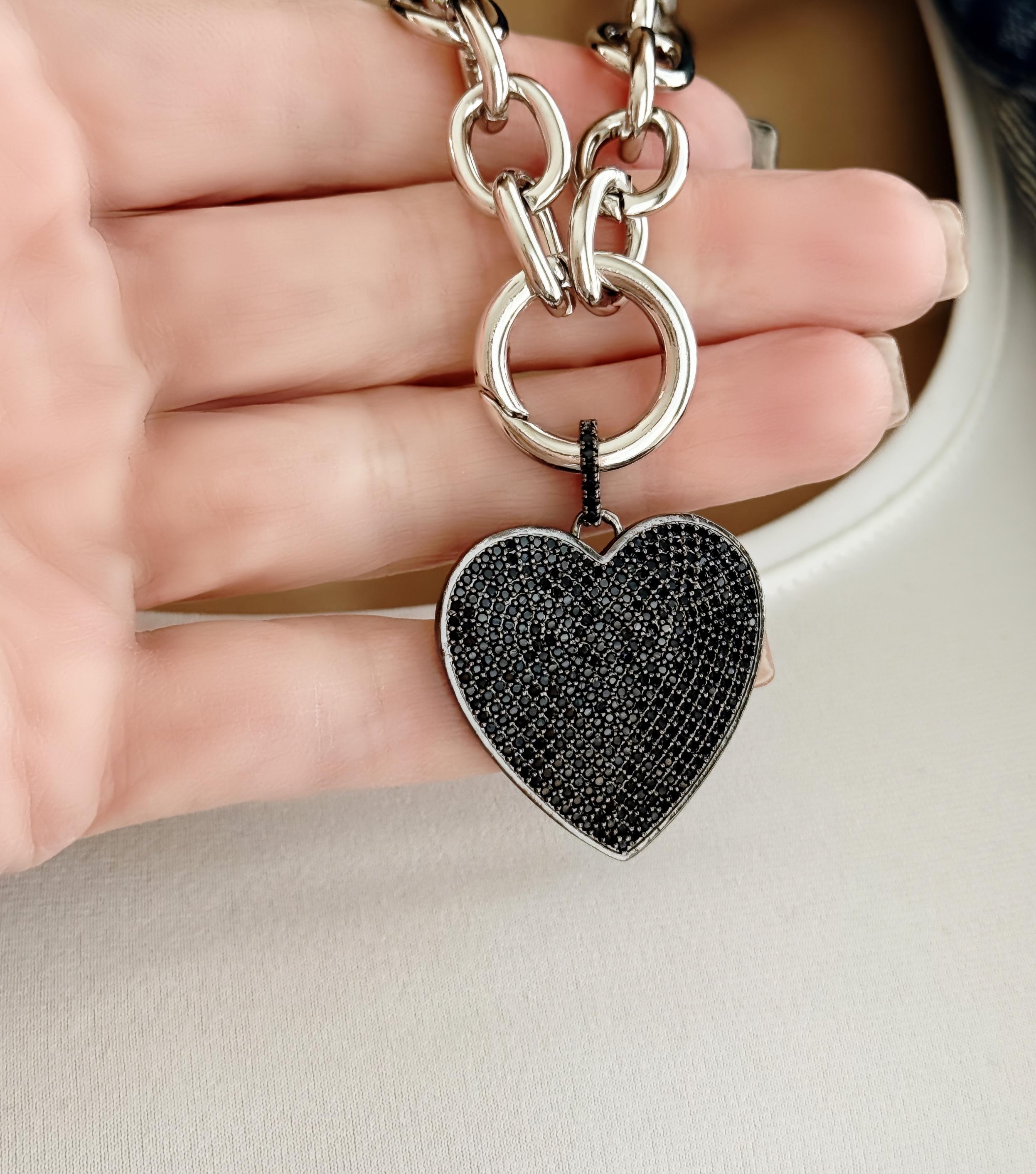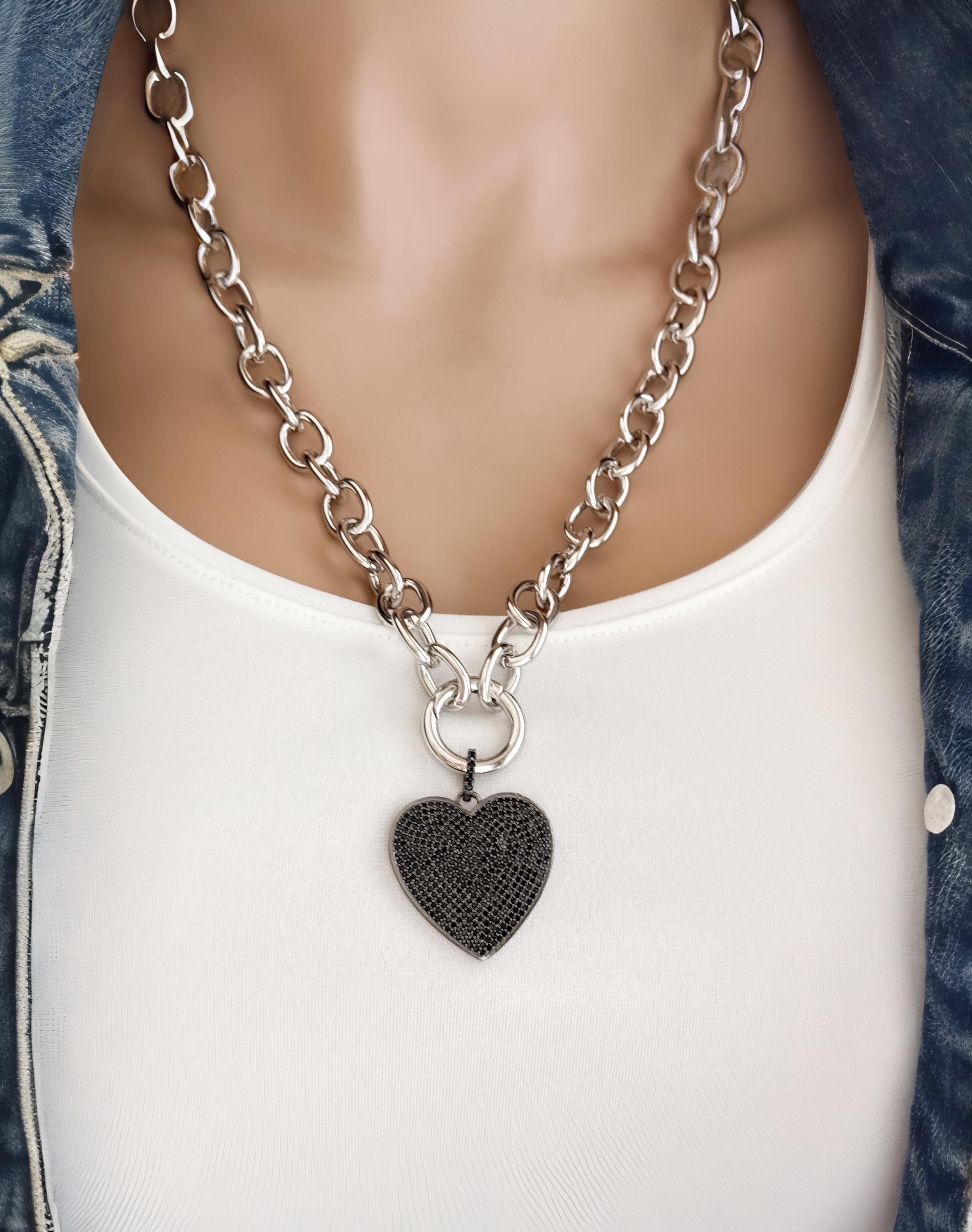 ♥ The focal point is a large paved black heart pendant, dramatic sparkle with a little attitude. The contrast of polished silver links and the black shimmer makes this piece unforgettable.