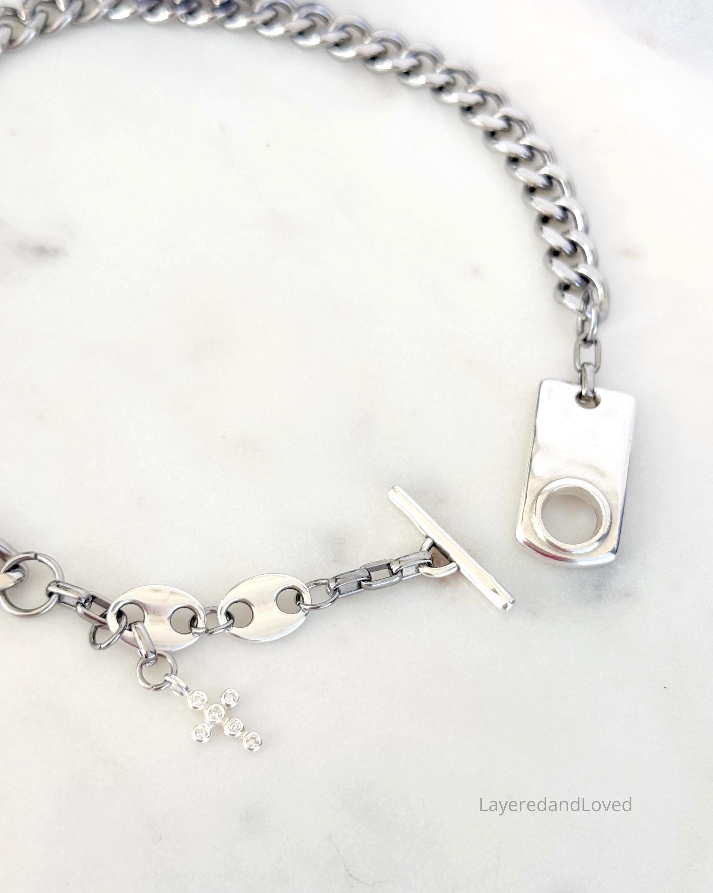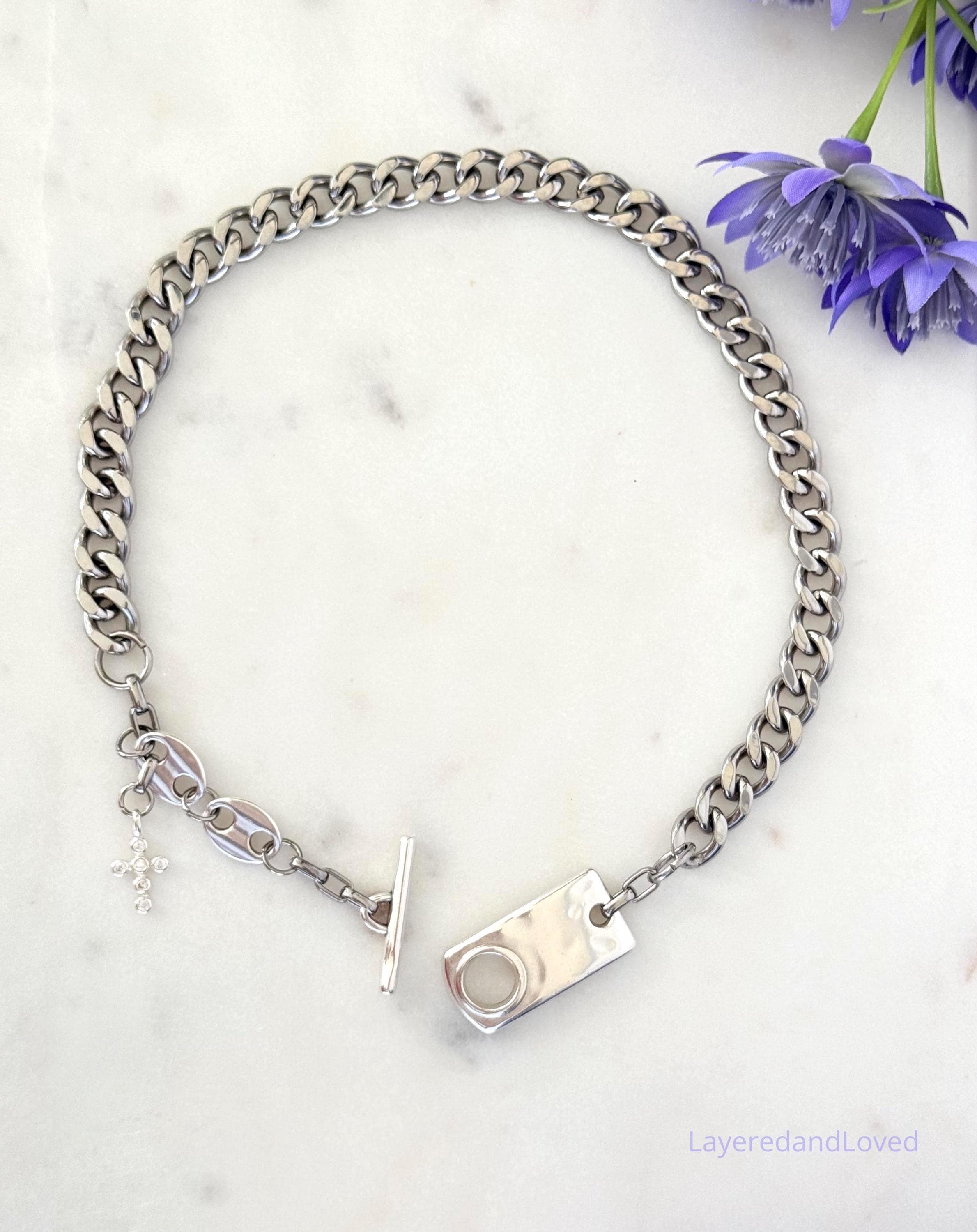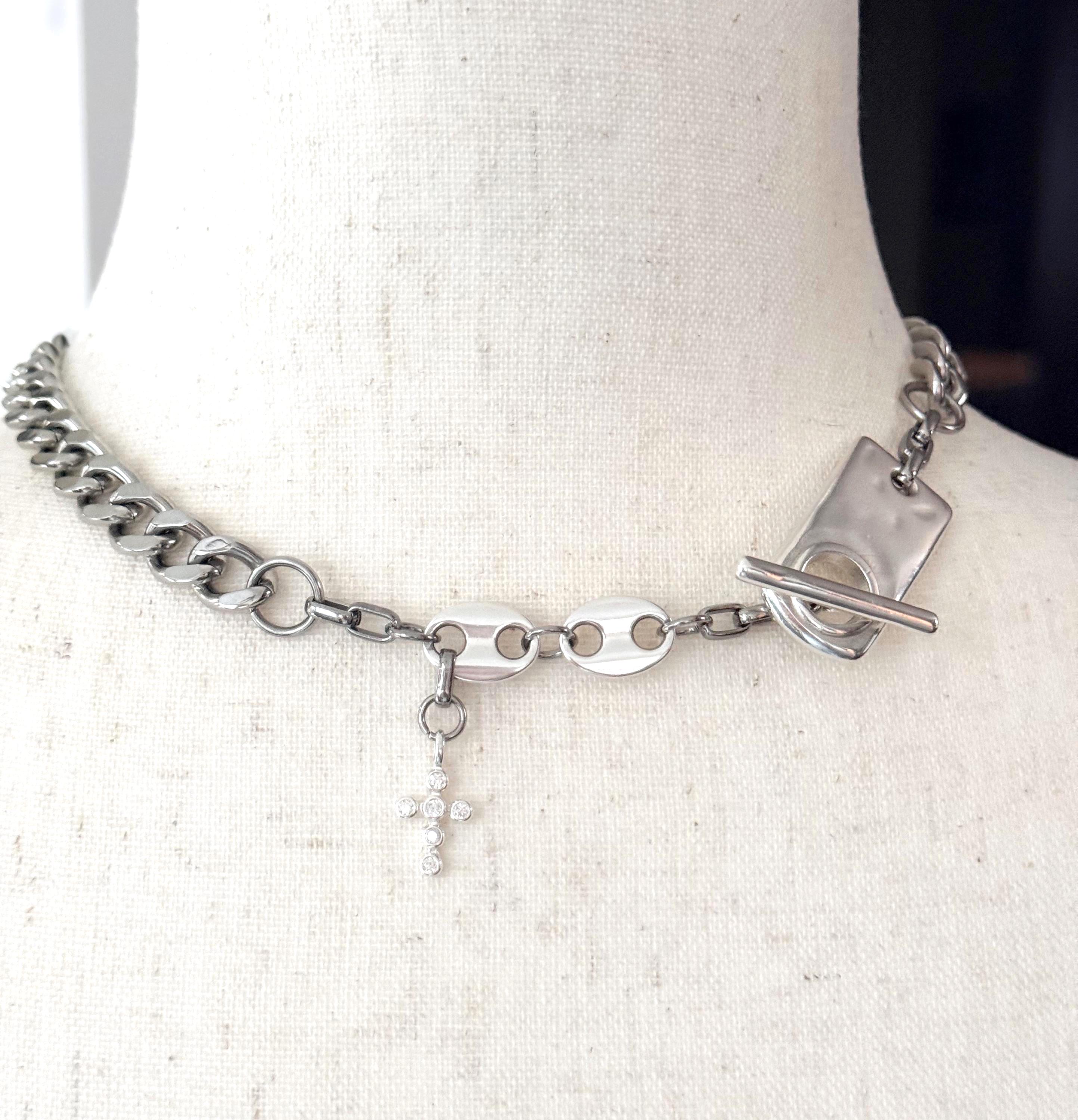 ♥ This piece features a substantial curb chain accented with marine style links, giving it a modern, elevated edge. The front facing, or at an angle, hammered rectangle toggle closure adds both function and artisan character, while a delicate sterling silver zircon cross dangles gracefully, bringing a touch of faith filled. elegance to this bold design.