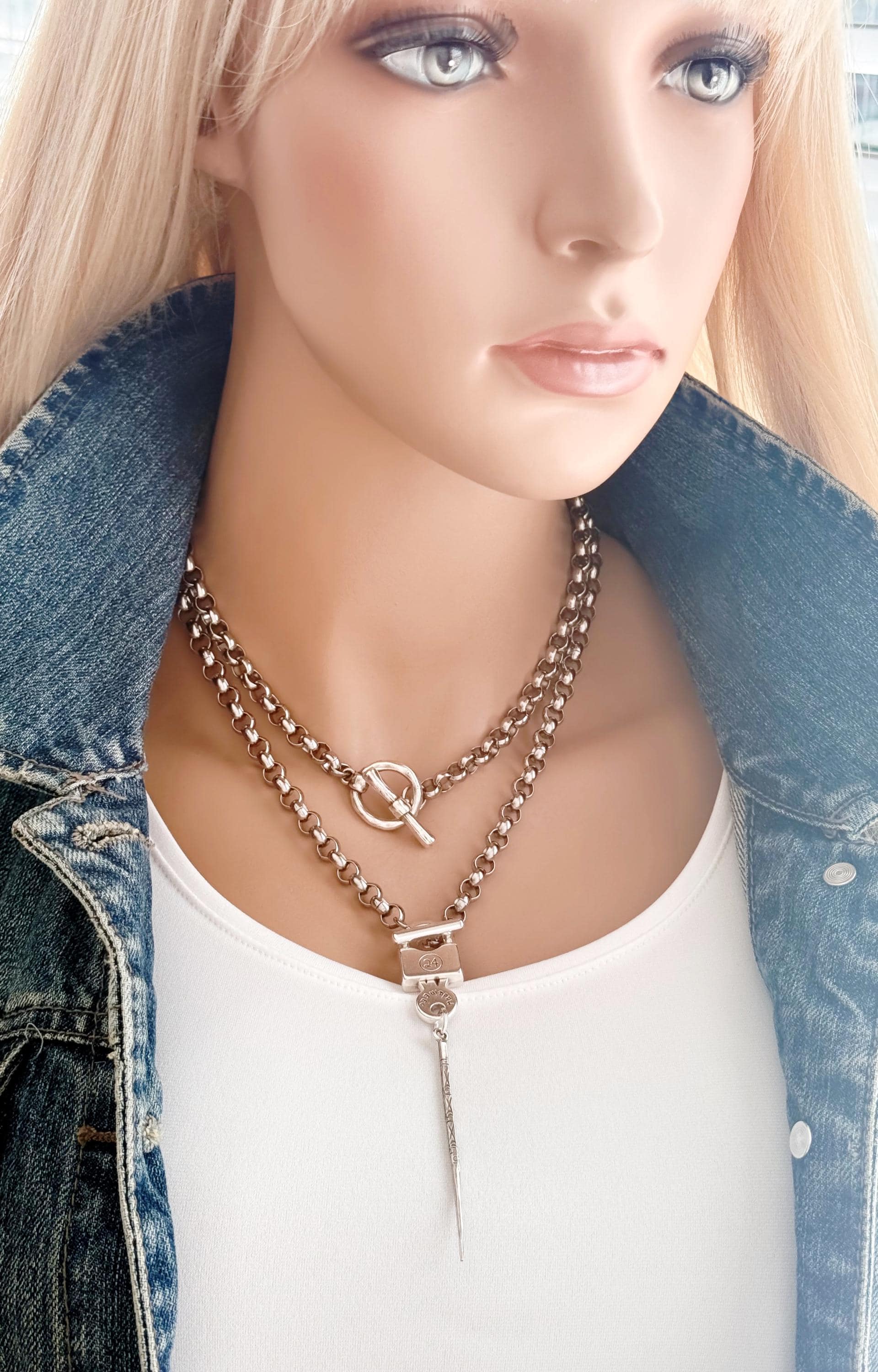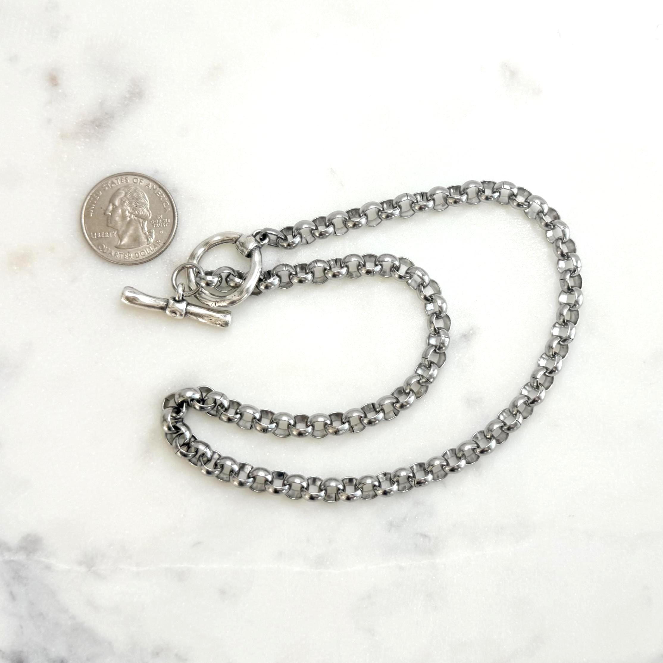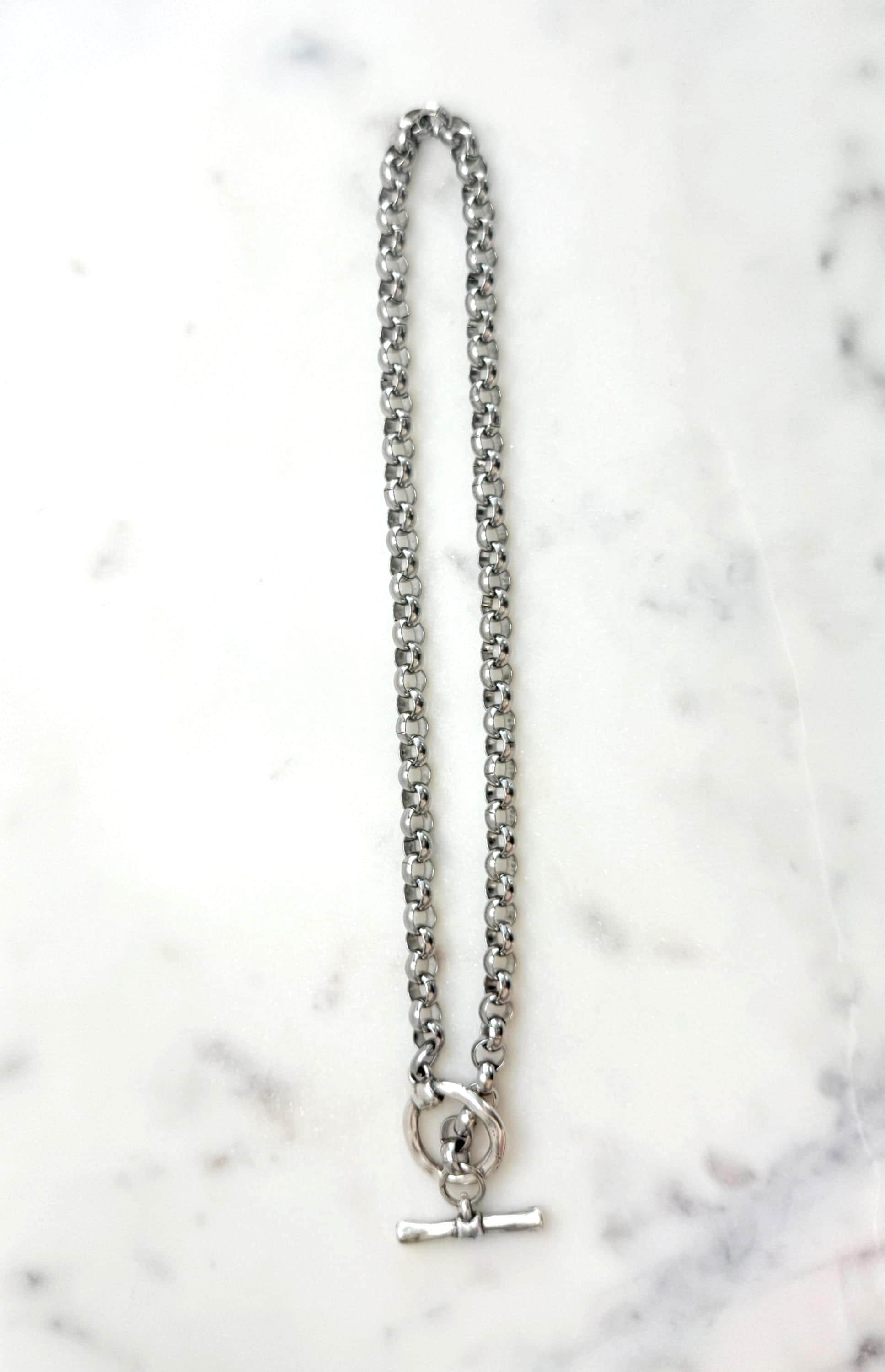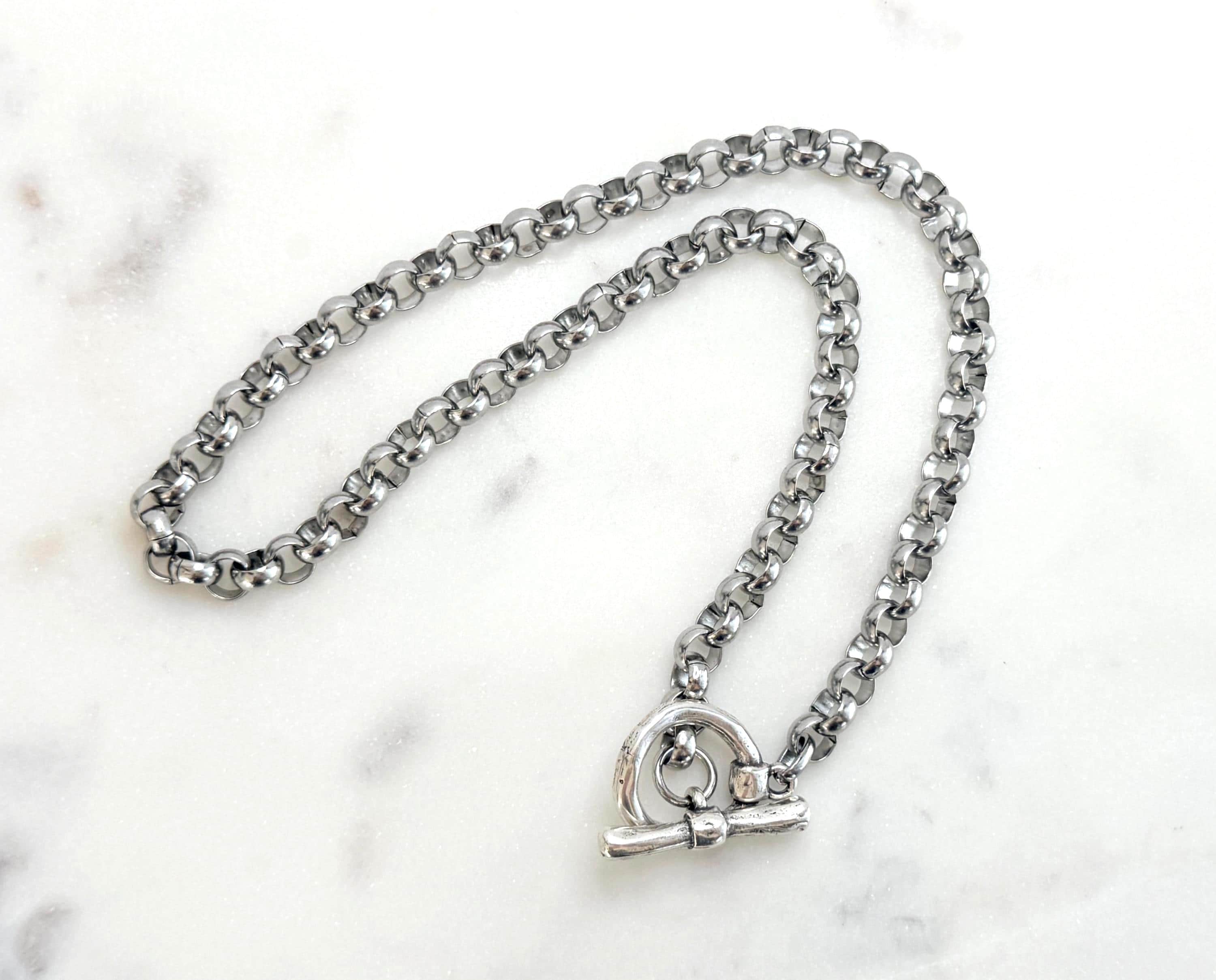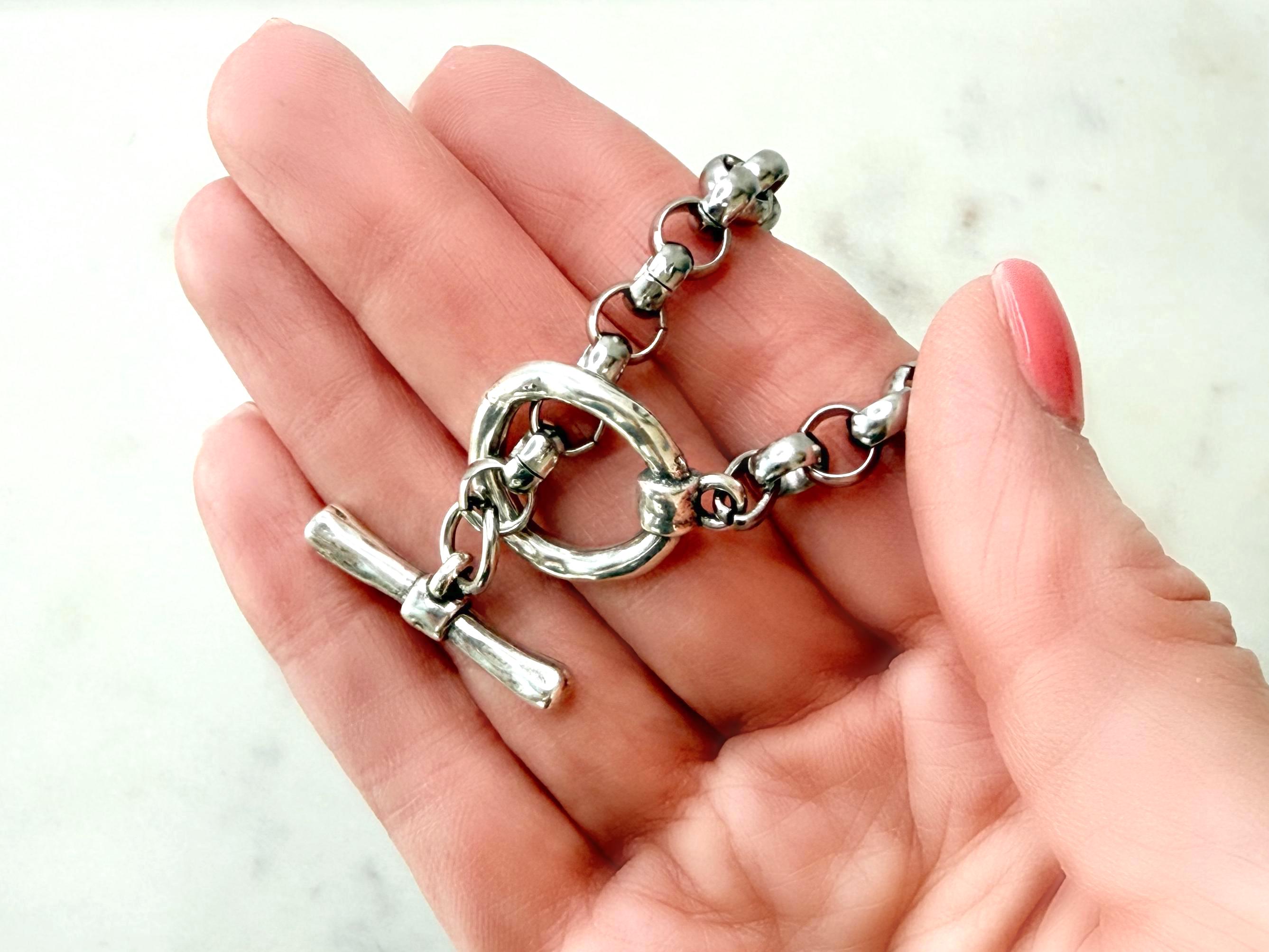 ♥ Crafted with a substantial 6mm rolo link chain, this piece offers a modern silhouette while maintaining a slightly vintage edge, thanks to its antique silver toggle clasp. The European made clasp is crafted from zamak, adding both character and quality to the design.