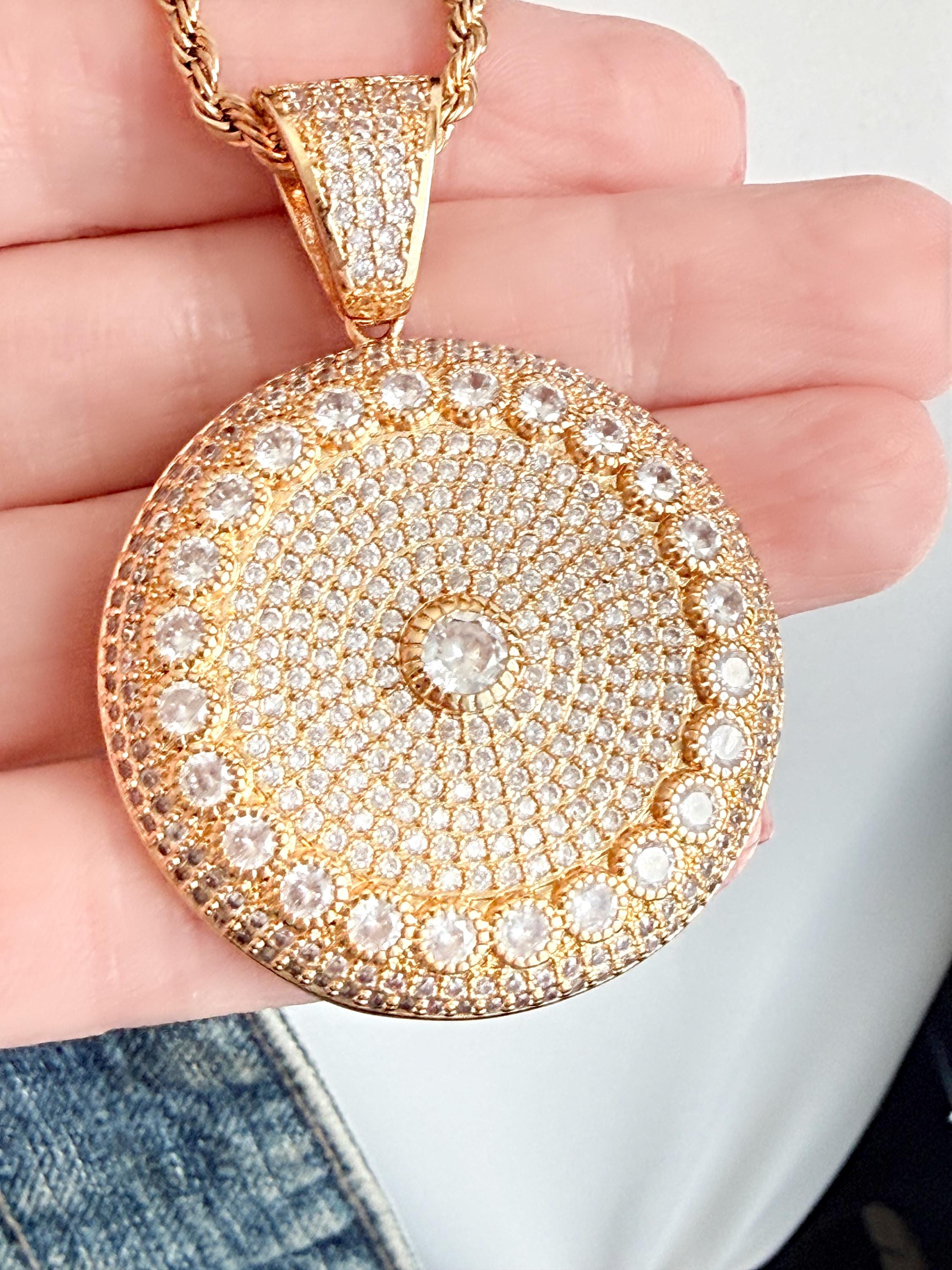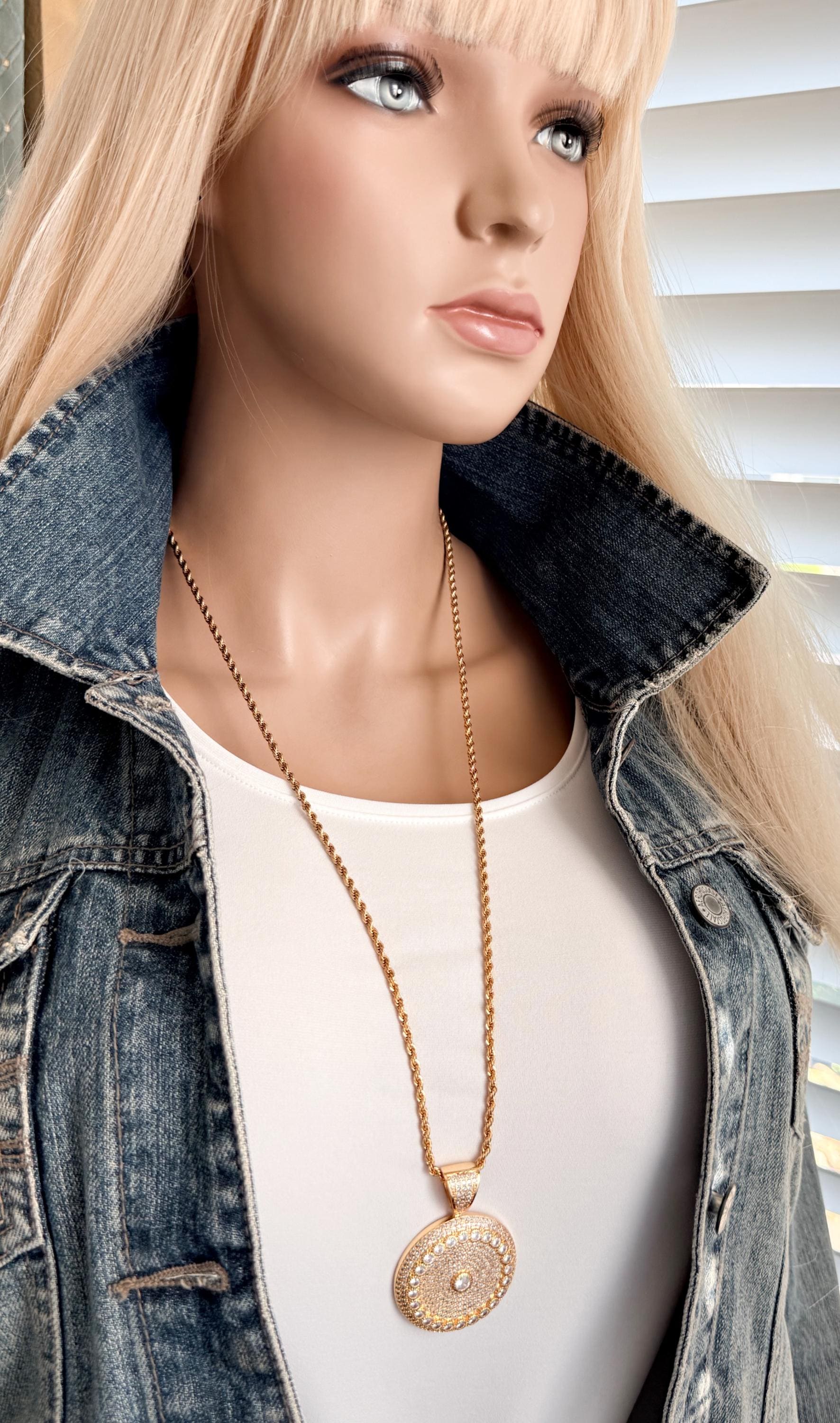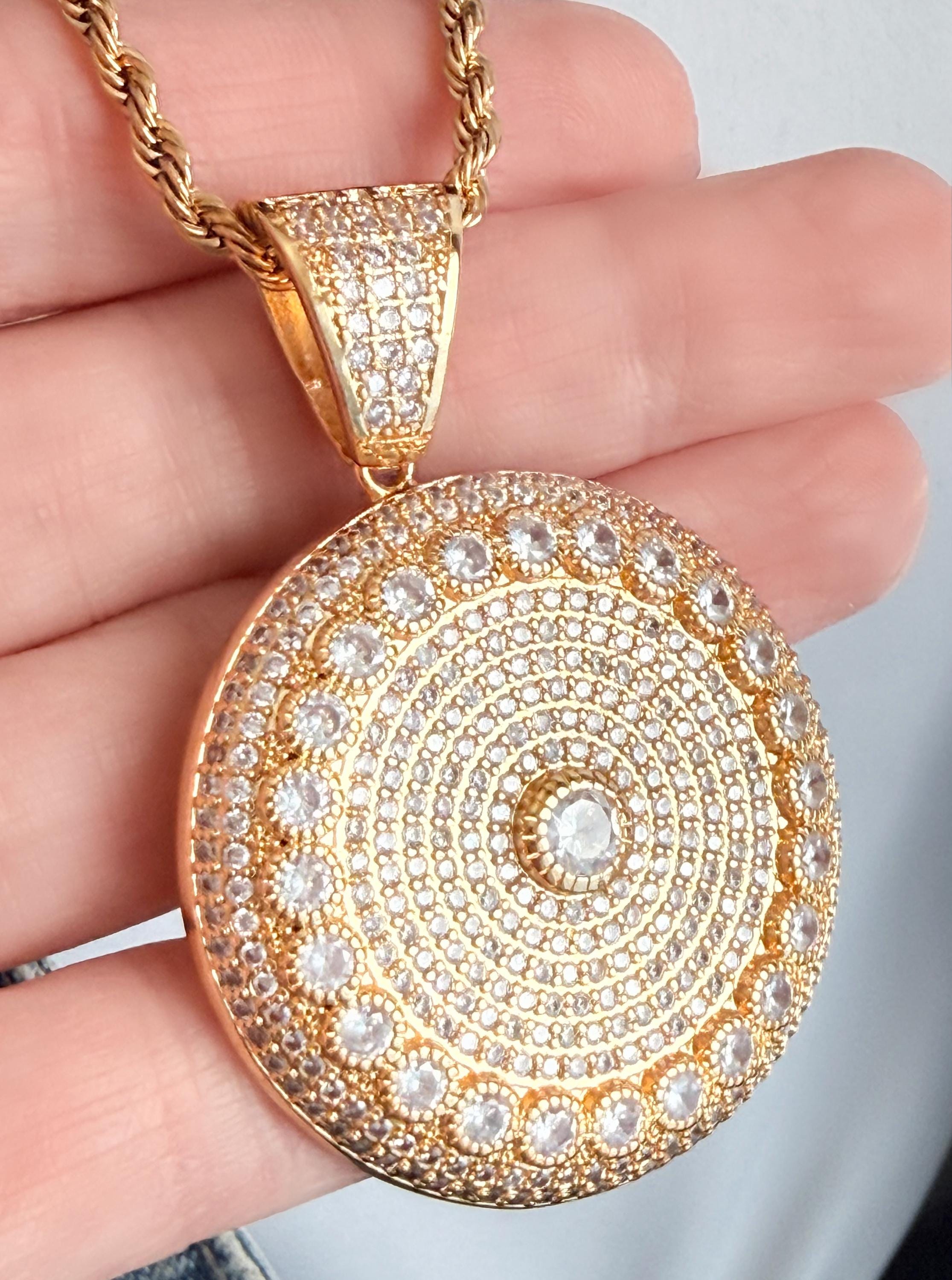 ♥ - This oversized mandala-inspired pendant features layers of shimmering zircon stones set in a radiant circular design, paired with a long gold-plated rope chain for a dramatic, elevated look. Designed to stand out, this piece is perfect for styling solo or layering with shorter chains for a modern stacked effect.