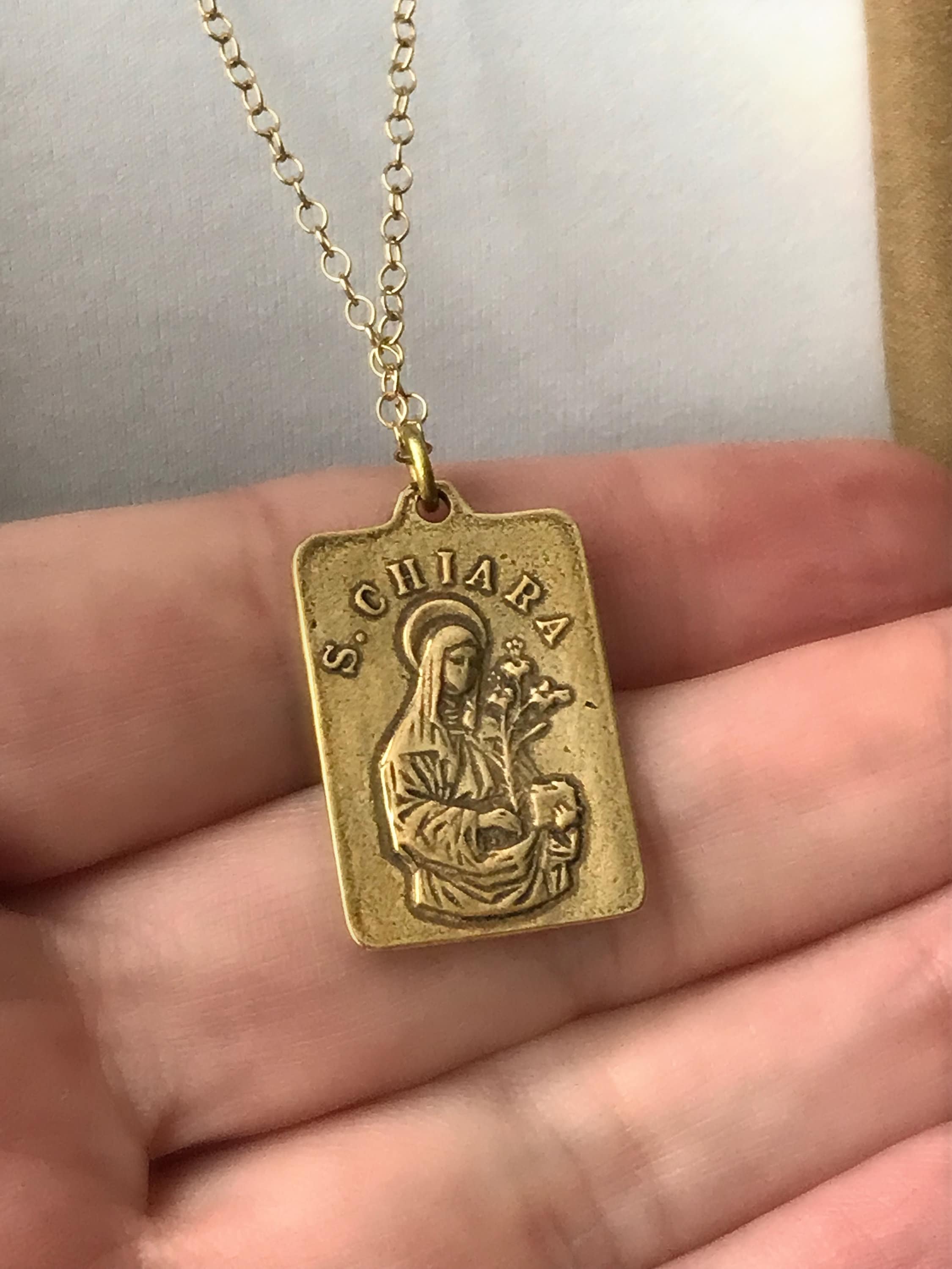 ♥ - Beautifully detailed artisan medallion. Front side is Saint Francis, reverse side is S. Chiara. (History below). You have a choice of which long length works for you. This also makes a great layer to wear with a shorter cross necklace or any other shorter necklace you like.