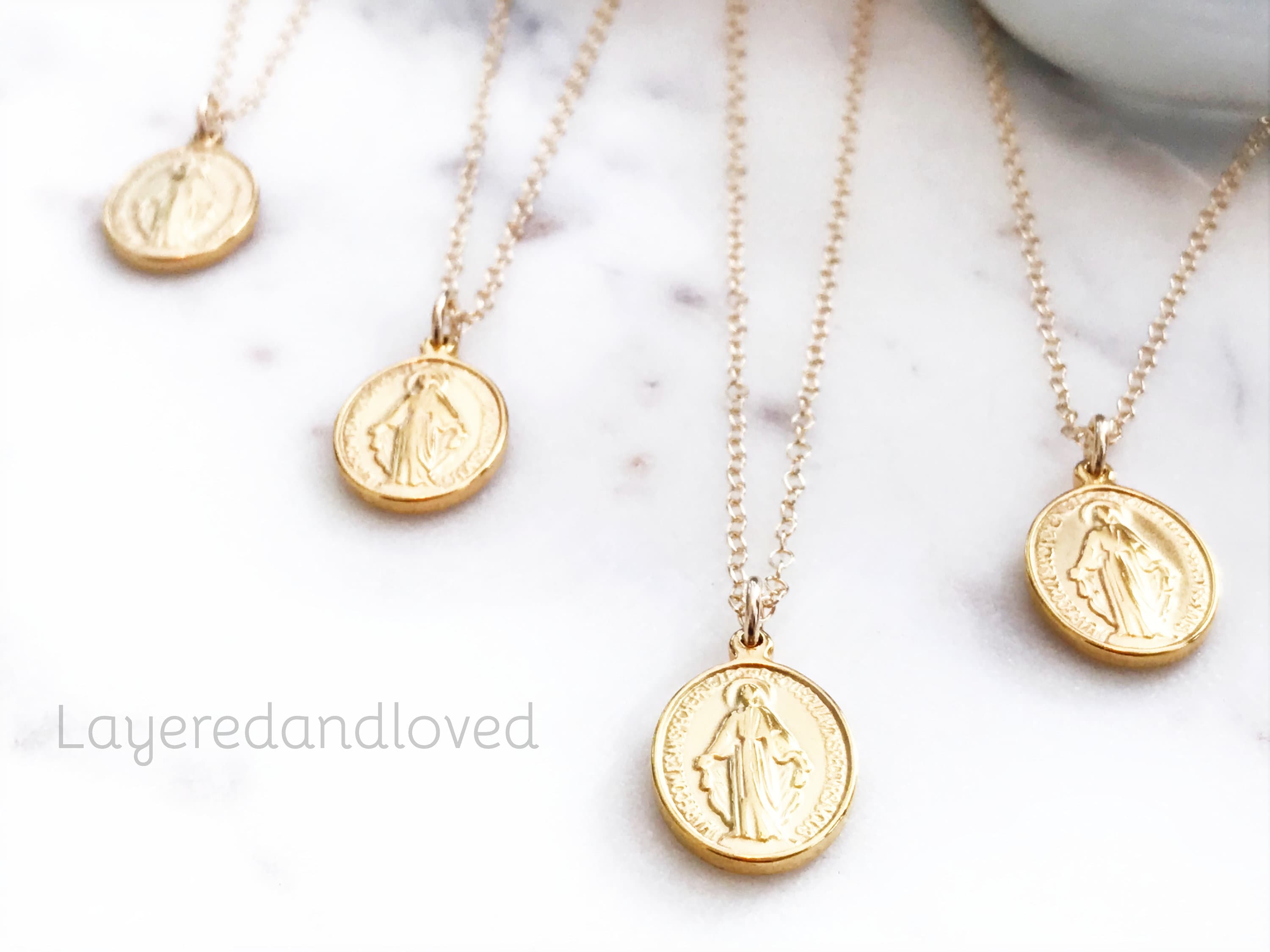 ♥ - Gold Mother Mary necklace on a 14k gold filled chain. Your necklace will also be finished with a gemstone dangle of your choice. Choose the gemstone from the picture shown and enter the name in the personalization box under the price.