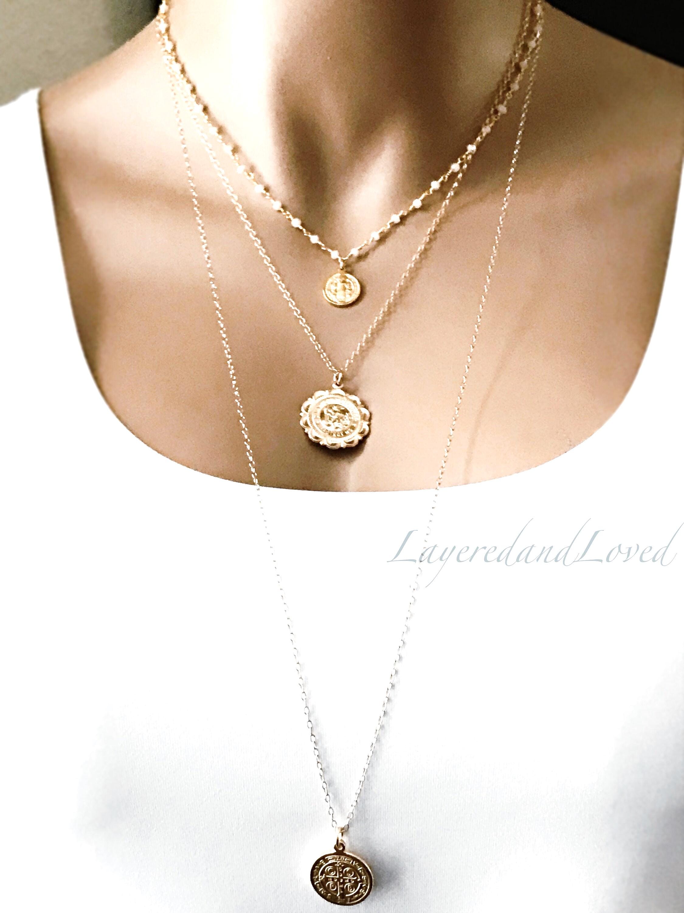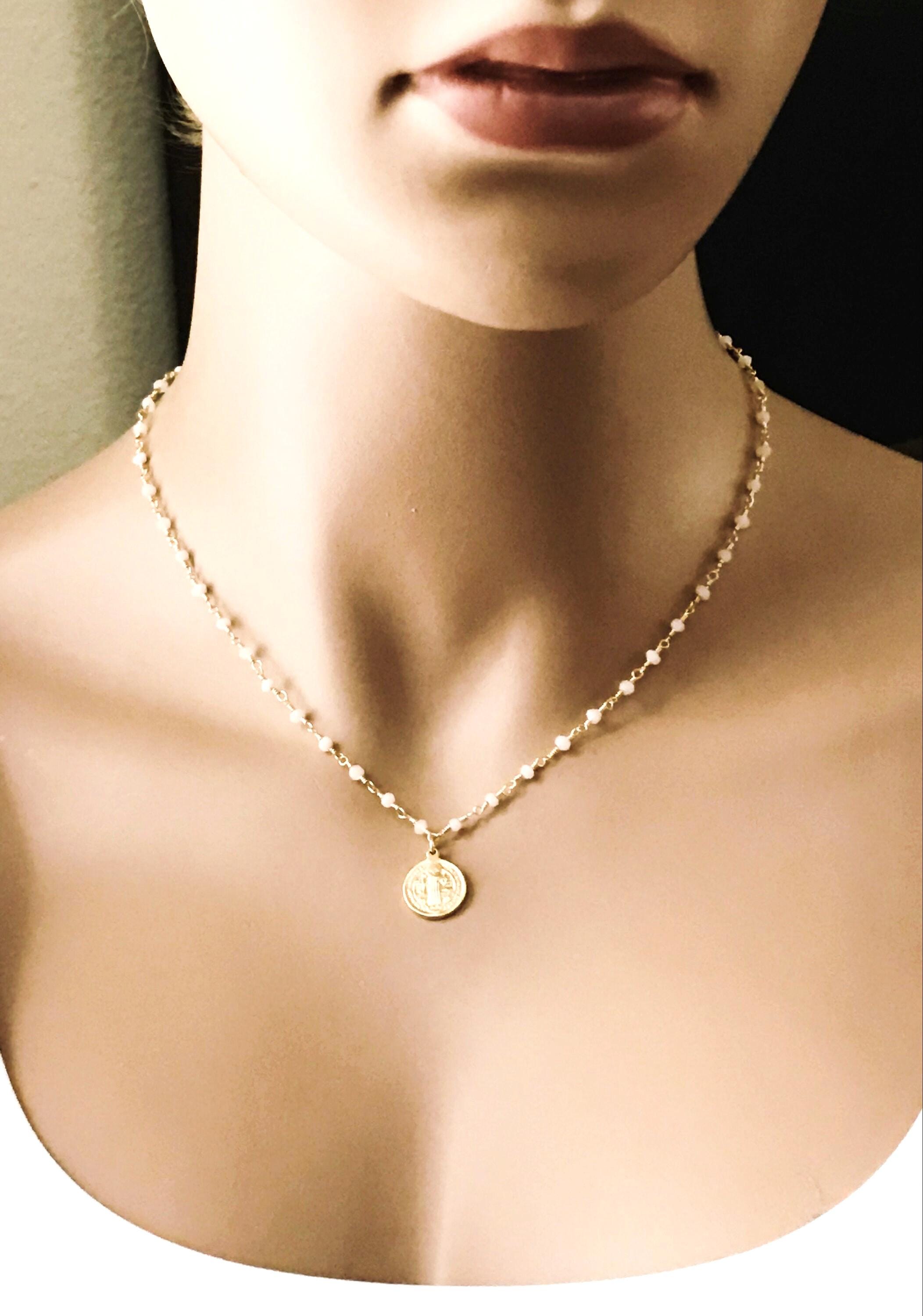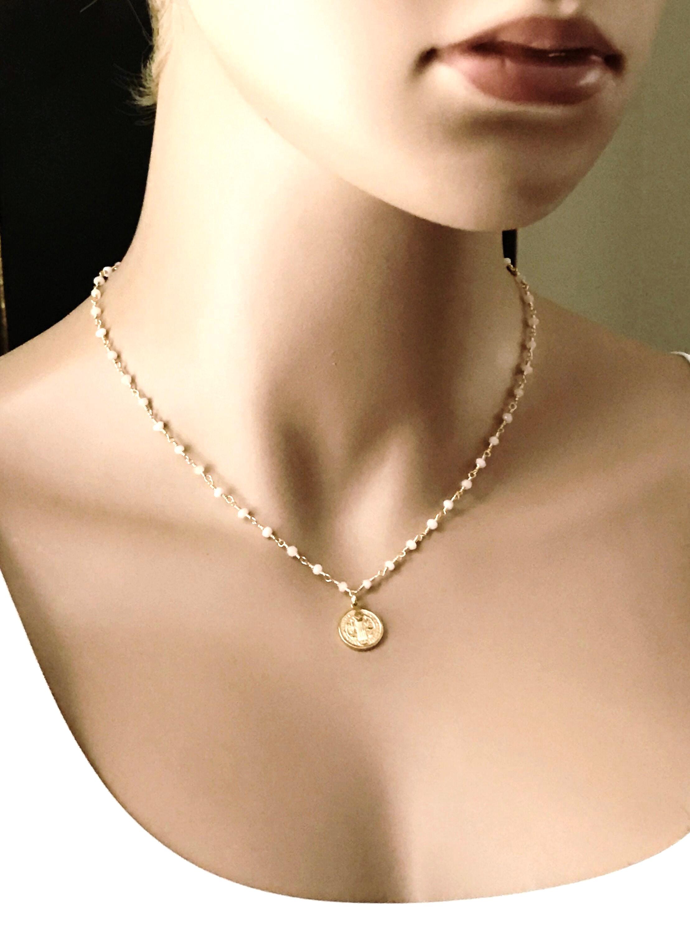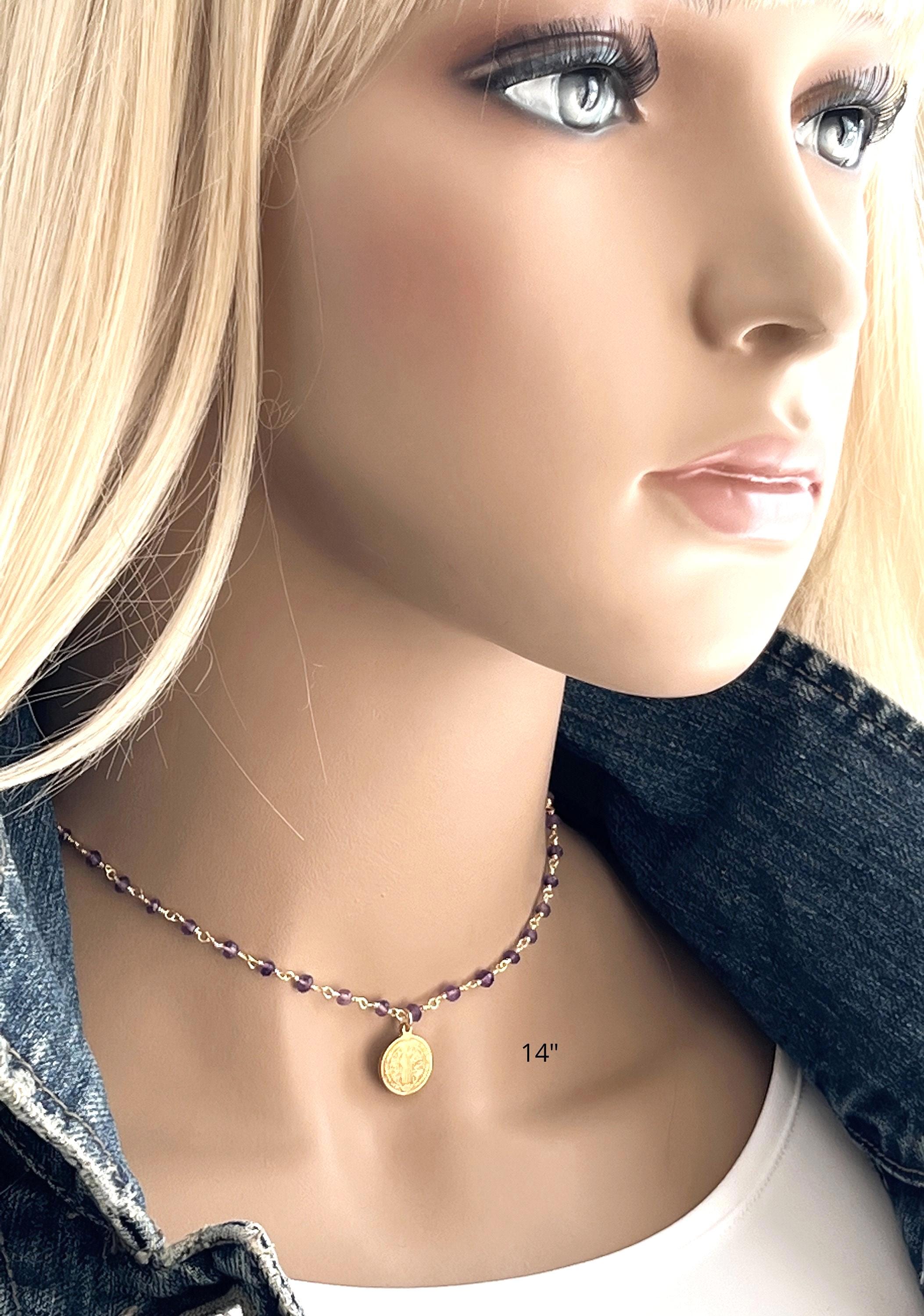 ♥ - Wonderful gemstone chain with a gold Saint Benedict coin. Length on the mannequin is 16".