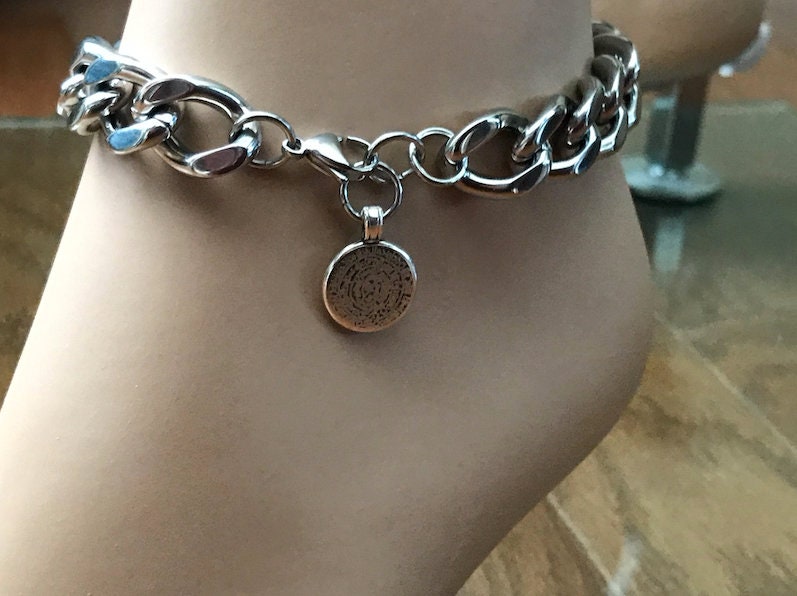 Stand out in a crowd with a great looking silver stainless steel thick curb chain anklet with a Phaistos dangling charm.