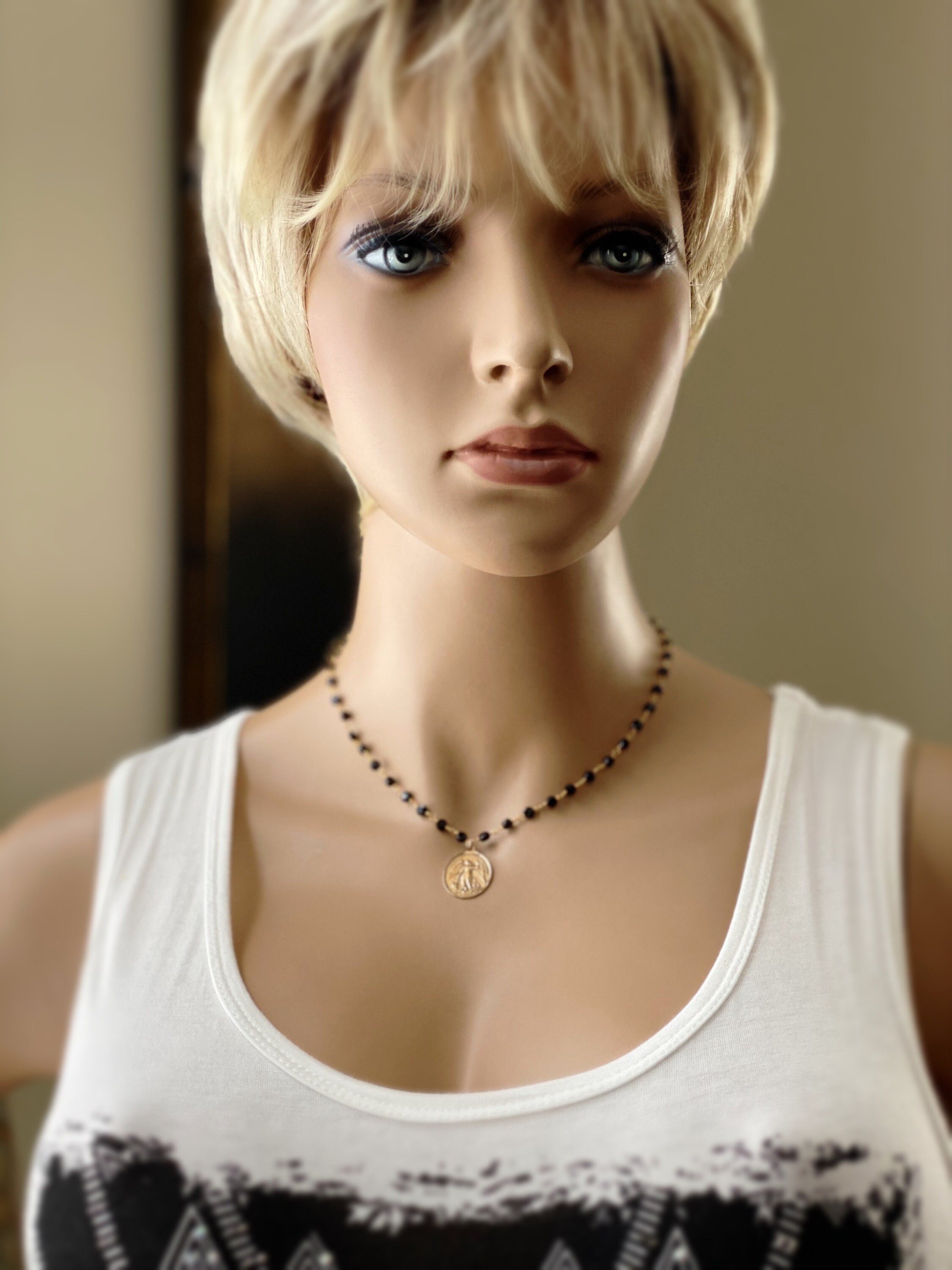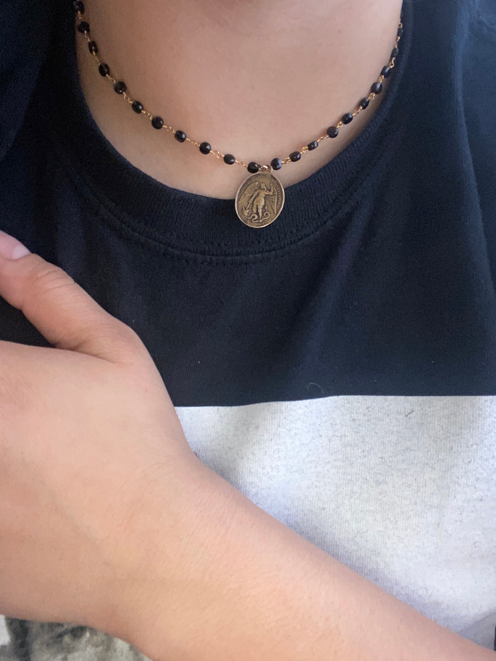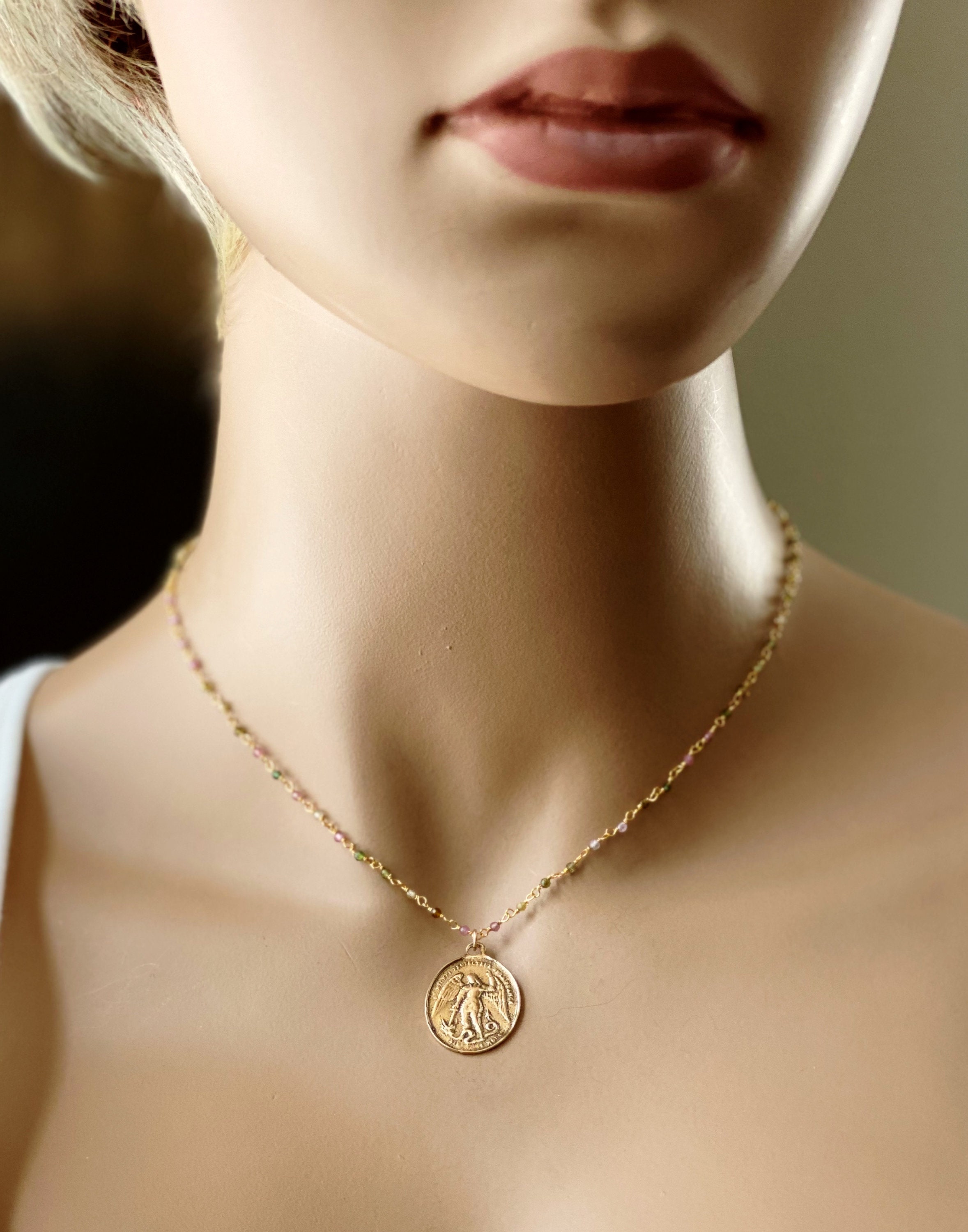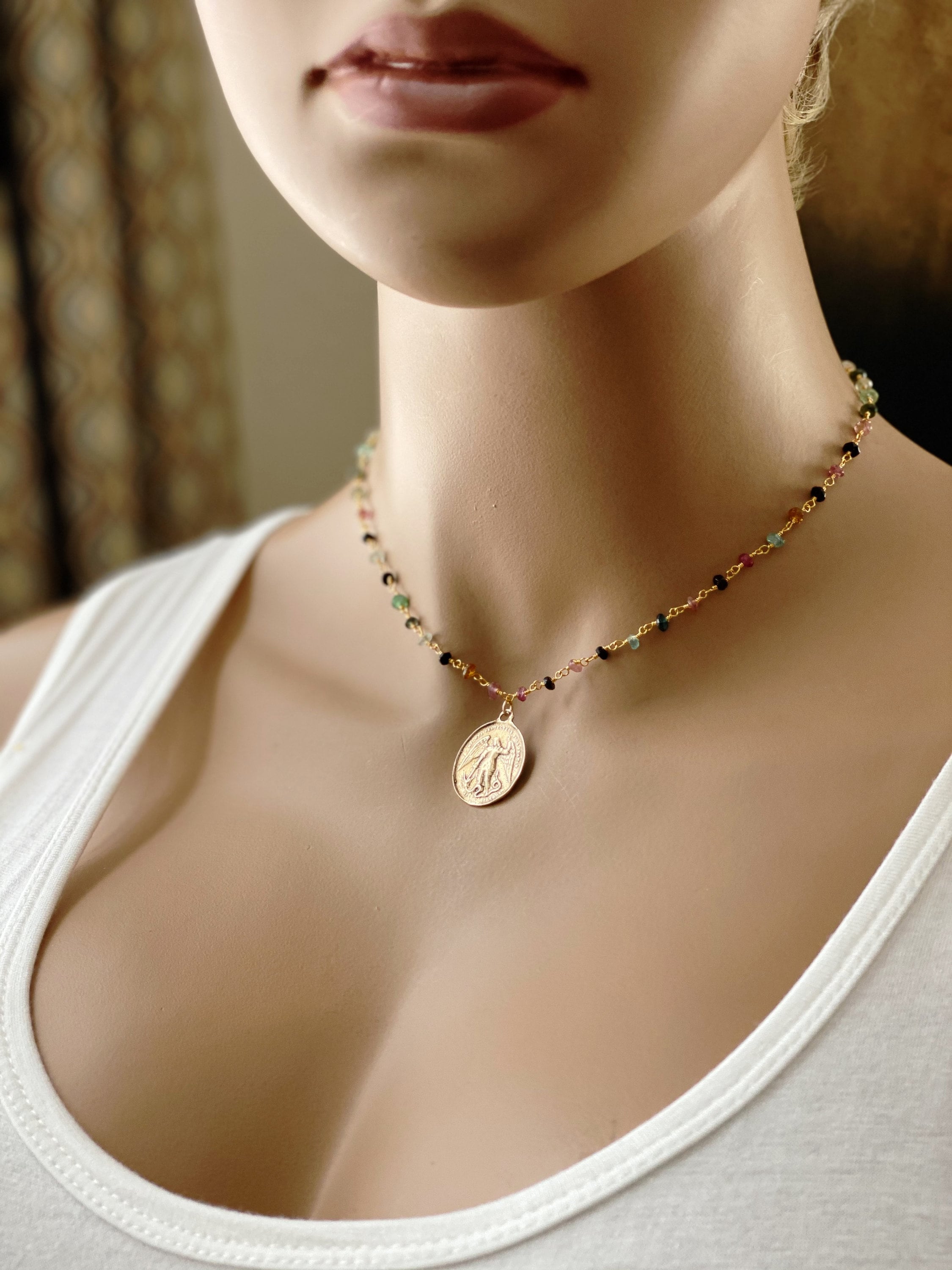 ♥ - Your choice of a small black spinel or a beautiful faceted black spinel disc gemstone rosary chain or a multi tourmaline gemstone, tiny round or small slice, rosary chain. Photos are similar to what you will receive. This is a popular necklace and I'm always ordering new gems. The gemstones are always high quality but might not look identical to the photos, as each cut of tourmaline and black spinel differs. The gold bronze coin is light weight and polishes up just like the gold filled chain extender, if you choose to add an extender, with the polishing cloth that is included with your order.